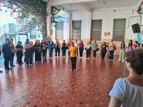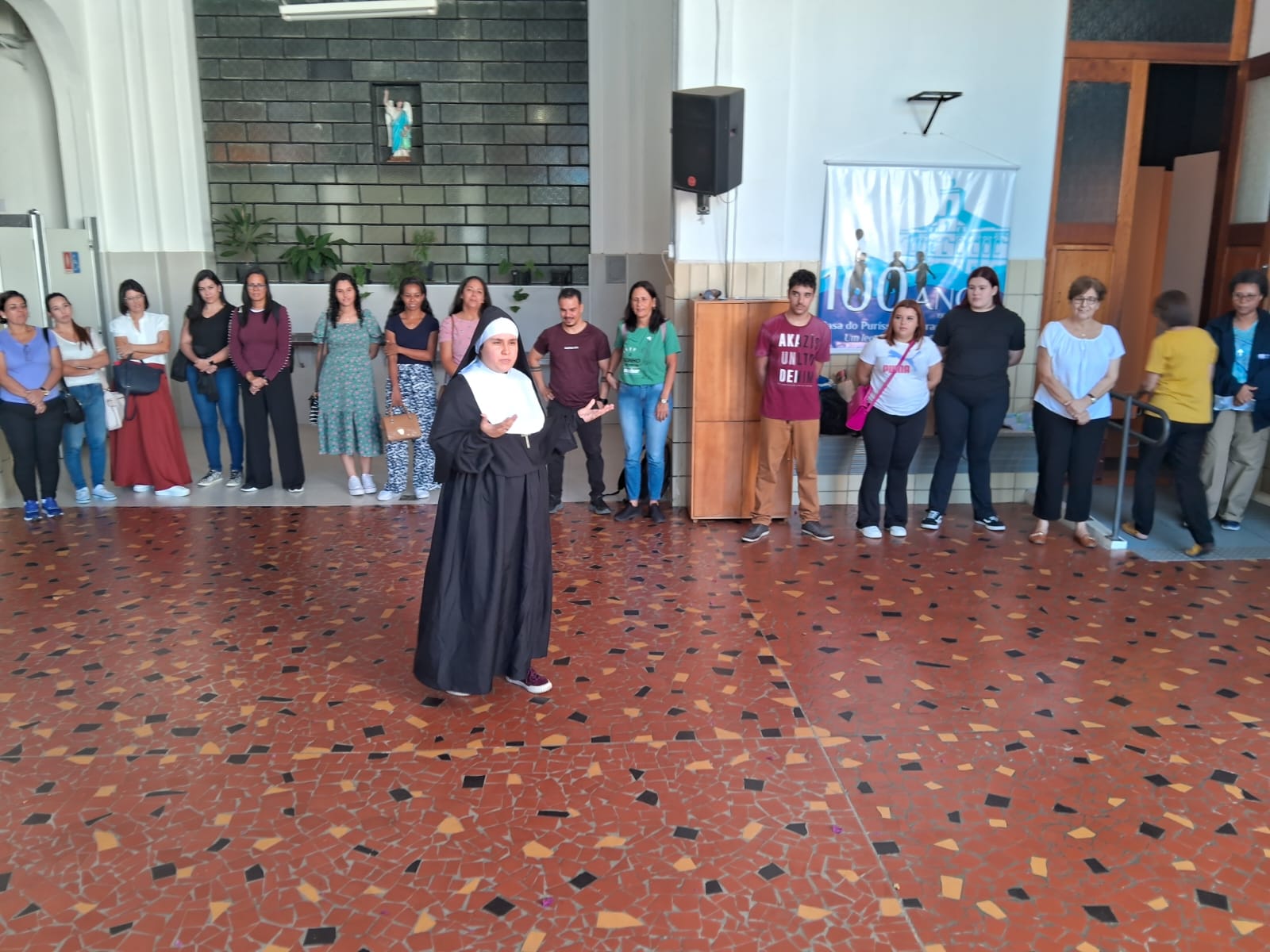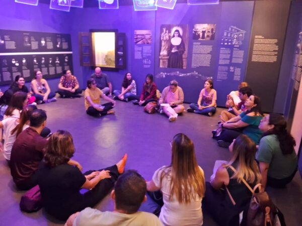Ao finalizar as oficinas, os educadores se reuniram na capela da Casa do Puríssimo Coração de Maria e conheceram um pouco de sua história contada detalhadamente pela Irmã Luana, assim como a da Gruta de Nossa Senhora de Lourdes situada na entrada desse espaço sagrado.