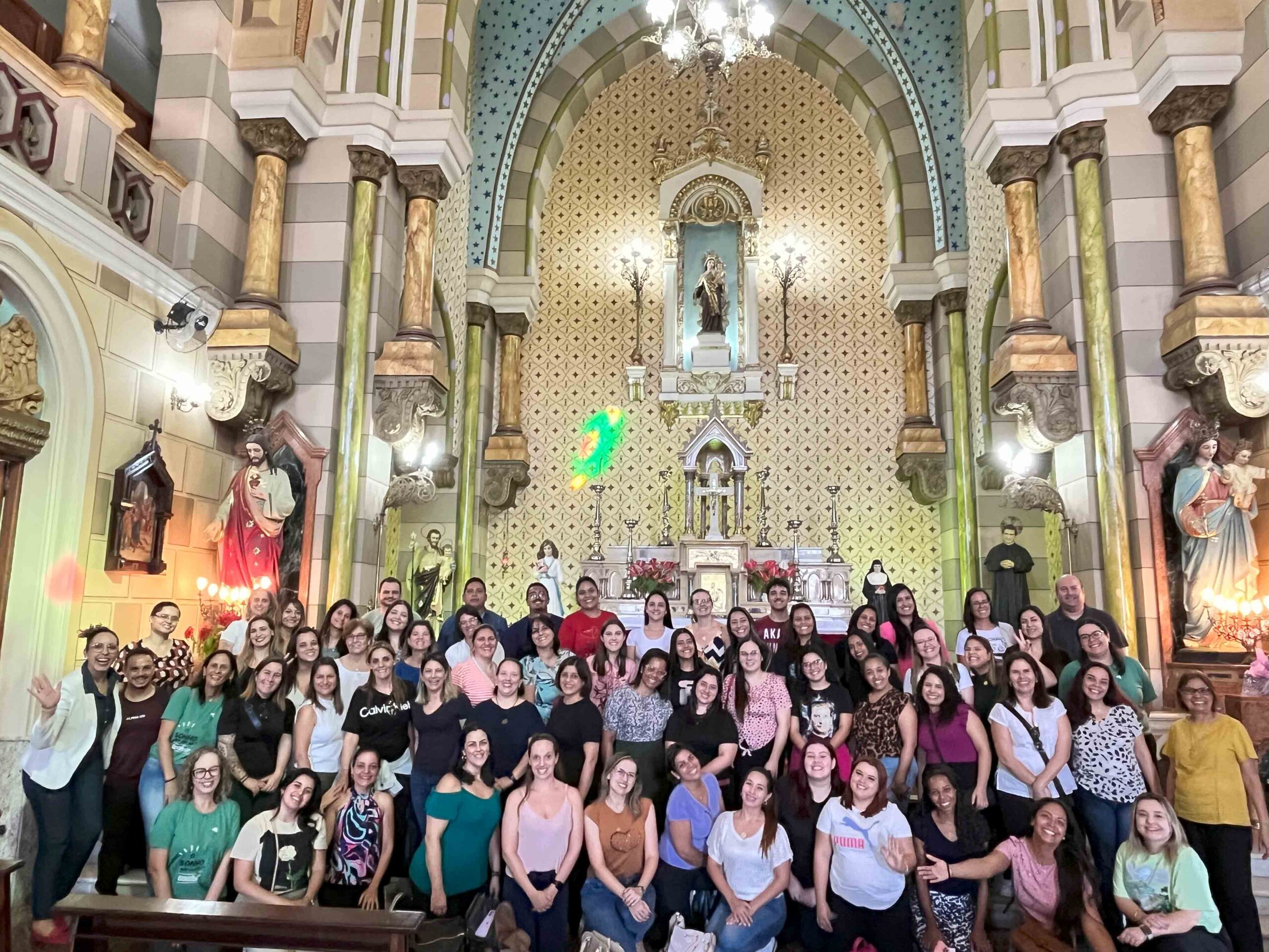 O período da tarde teve início com o almoço na primeira casa das FMA fundada no Brasil, o Instituto Nossa Senhora do Carmo, também localizada em Guaratinguetá - SP. Em seguida, em um clima de fraterna convivência, todos os educadores participantes se reuniram na capela do Colégio do Carmo para rezar e compartilhar suas percepções sobre as significativas experiências do período da manhã. Também visitaram outros espaços da escola, como a “Galeria” de fotos de todas as Diretoras desta primeira instituição salesiana no país, a “Sala de Memórias”, local que ilustra em suas paredes importantes registros fotográficos desde a fundação até os tempos atuais e o “Espaço São José”. Como recordação, a janela, a máquina de costura e o poço, figuras simbólicas da missão salesiana de Madre Mazzarello, foram esculpidas em singelas peças de madeira e entregues para cada educador(a), acompanhadas de um cartão expressando sincera “gratidão” pelos momentos vividos e compartilhados. No fim do dia, os agradecimentos pela rica «Experiência Mornesina» foram traduzidos em orações em uma linda celebração eucarística no Santuário Nacional de Nossa Senhora Aparecida (Aparecida - SP).