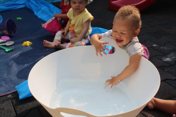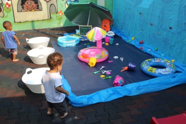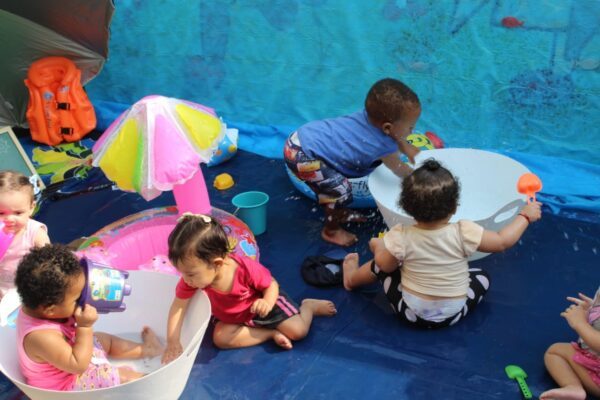 Num dia ensolarado, nada melhor do que um momento de muita diversão. As educadoras criaram um espaço bem atrativo e muito gostoso, literalmente uma praia dentro do CEI Pingo de Gente. «Não vamos negar: até nós professoras sentimos vontade de dar um mergulho. Aquelas mãozinhas pequenas que batiam na água pareciam grandes chafarizes a céu aberto e muitas carinhas com grandes sorrisos iluminavam aquele momento», concluíram Daniele e Ângela.