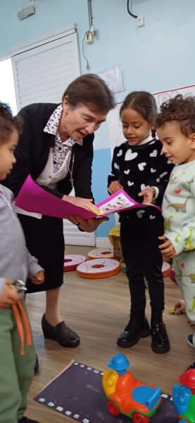 No CEI Pingo de Gente, a Irmã Paola foi recebida pela equipe coordenadora: Rosana Freitas, Diretora; Janaina Santos, Coordenadora Pedagógica; e Lindaura Nunes, Auxiliar Administrativa. Durante a visita, a turma do Mini Grupo 2 preparou uma apresentação simbólica em que construíram uma casa de tijolos, reforçando a importância da união e do trabalho em conjunto. A Irmã teve ainda um momento de partilha com as professoras, e os demais colaboradores (auxiliar de cozinha, apoio e enfermaria), destacando que a missão de todos nasce no coração e que o papel da educação é fundamental para o desenvolvimento humano.