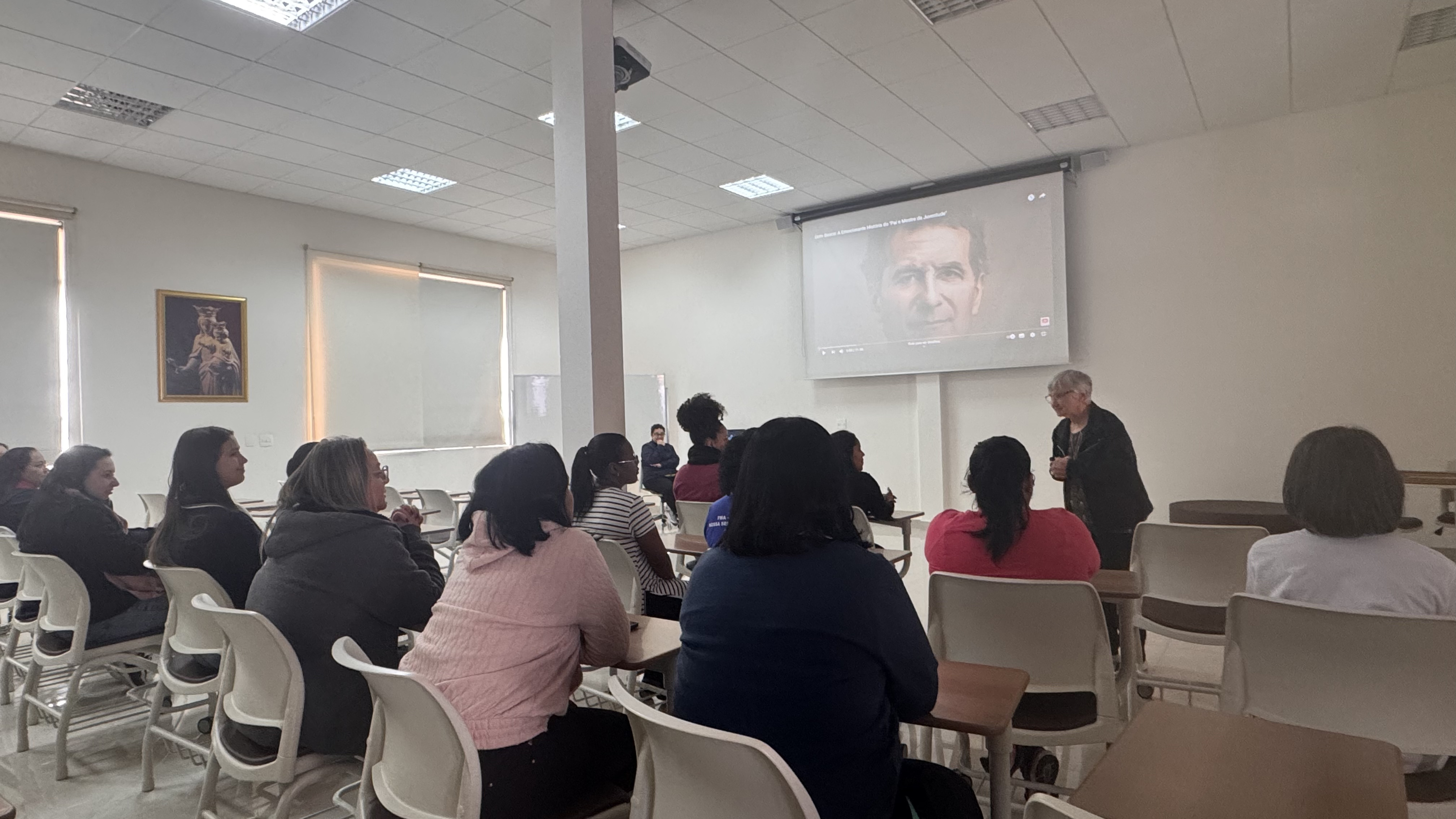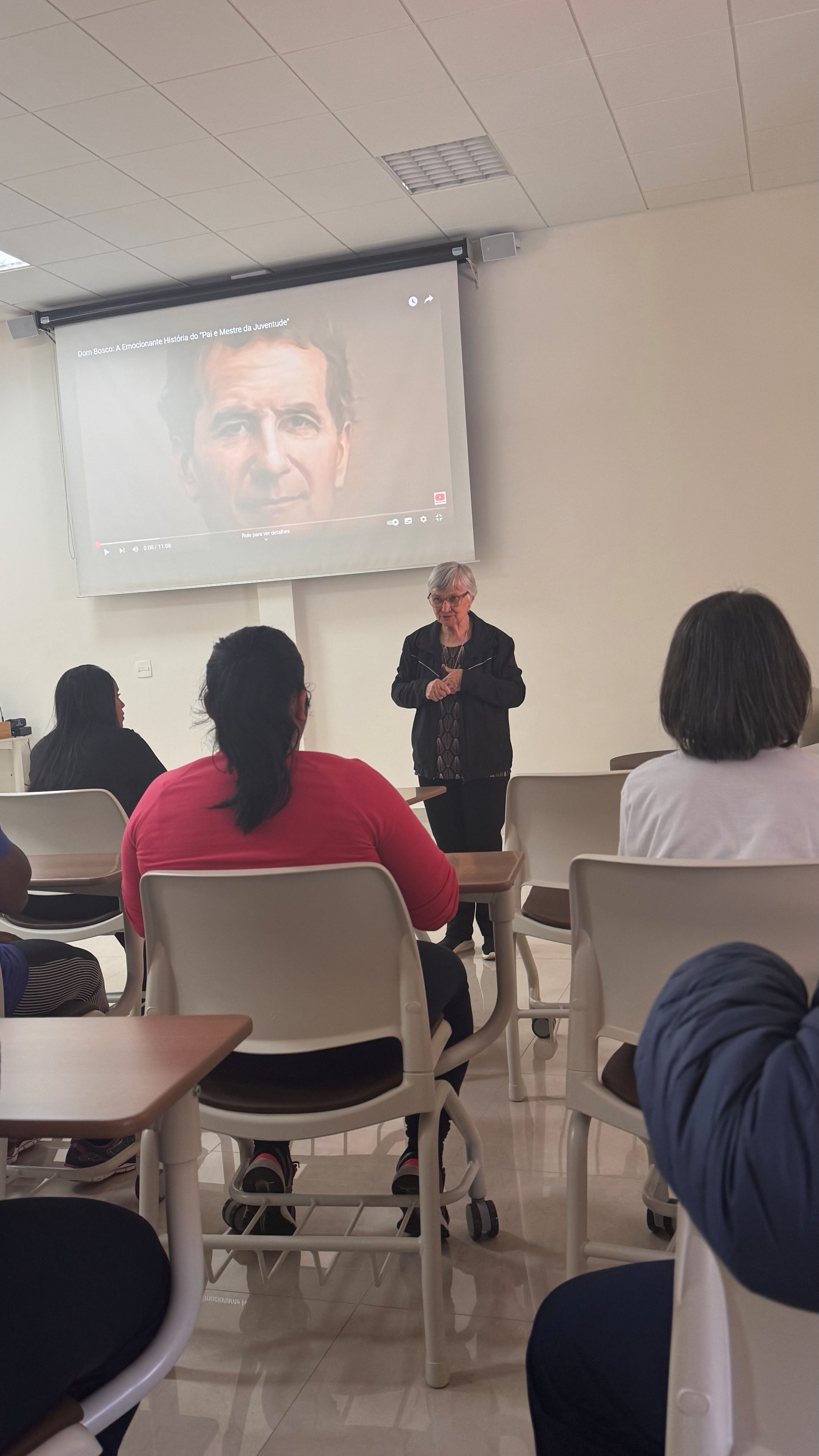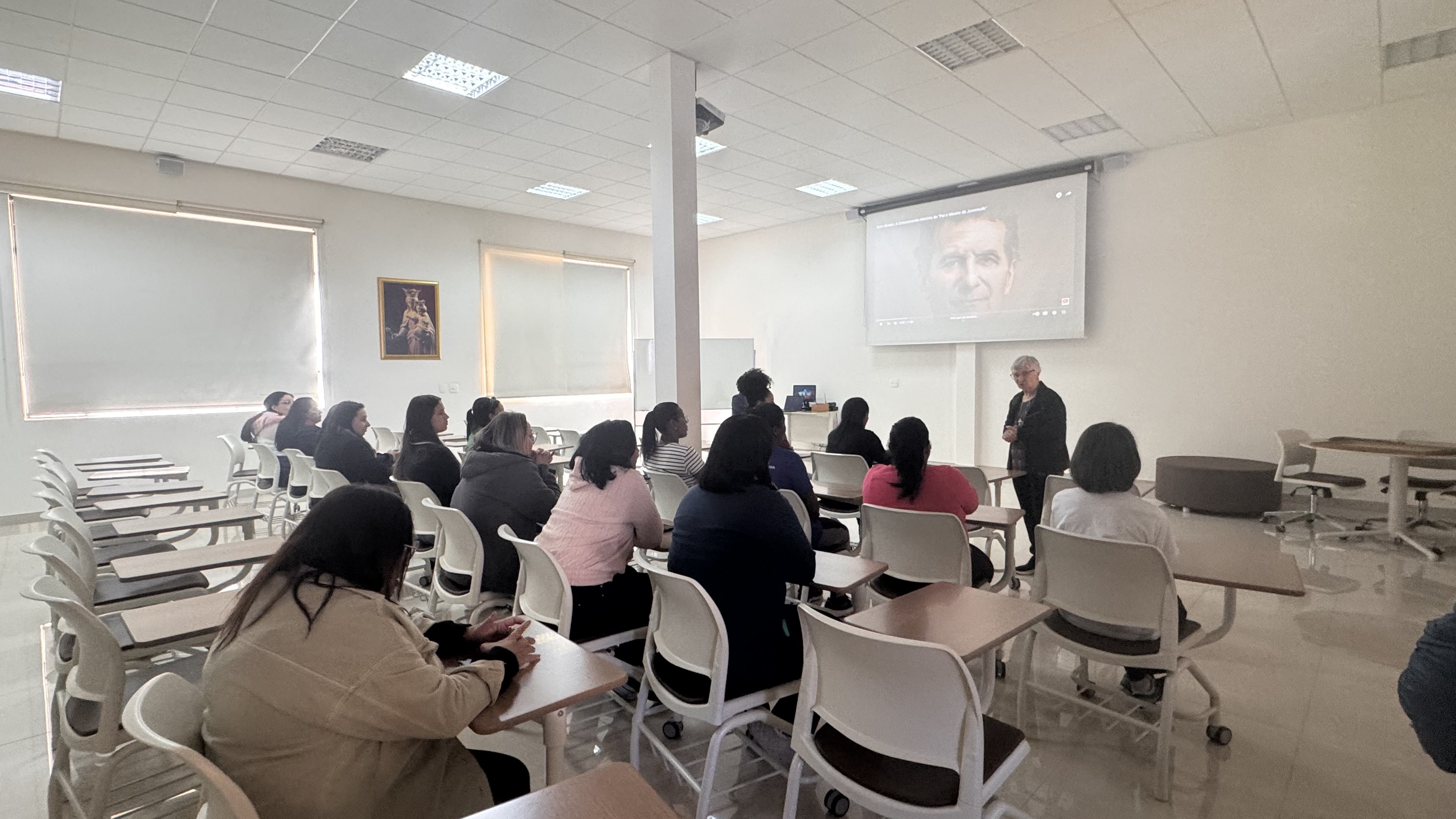 Durante o encontro, os educadores assistiram a um vídeo que apresentou a trajetória desses dois grandes fundadores, aprofundando o conhecimento sobre a vida e a missão que os uniu. Irmã Helena destacou aspectos essenciais da caminhada de Dom Bosco e de Madre Mazzarello, como a fé inabalável, a pedagogia do Sistema Preventivo — baseada na razão, na religião e na amabilidade — e a convicção de que todo educador é chamado a ser presença amiga, referência segura e inspiração para os jovens.
