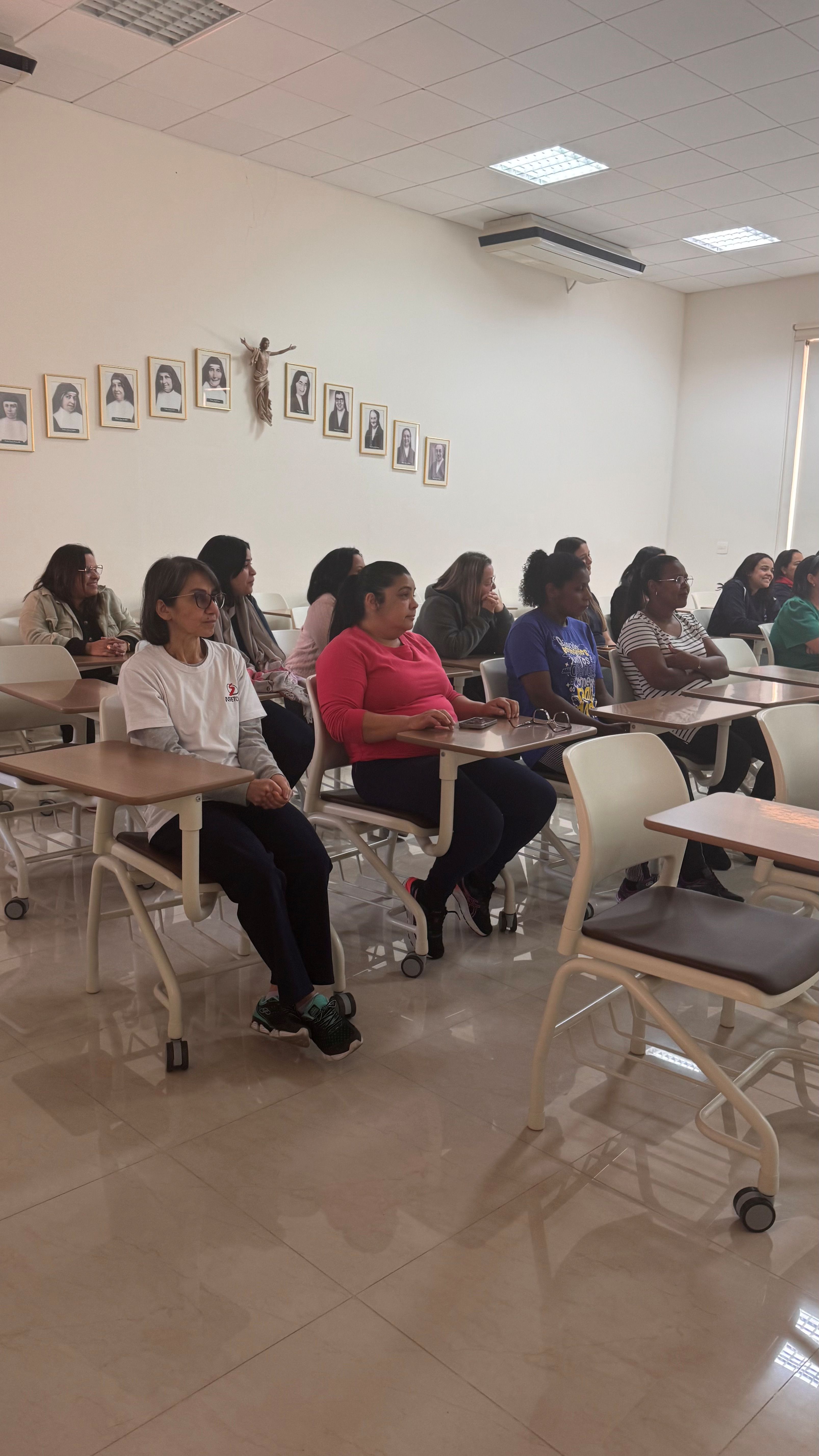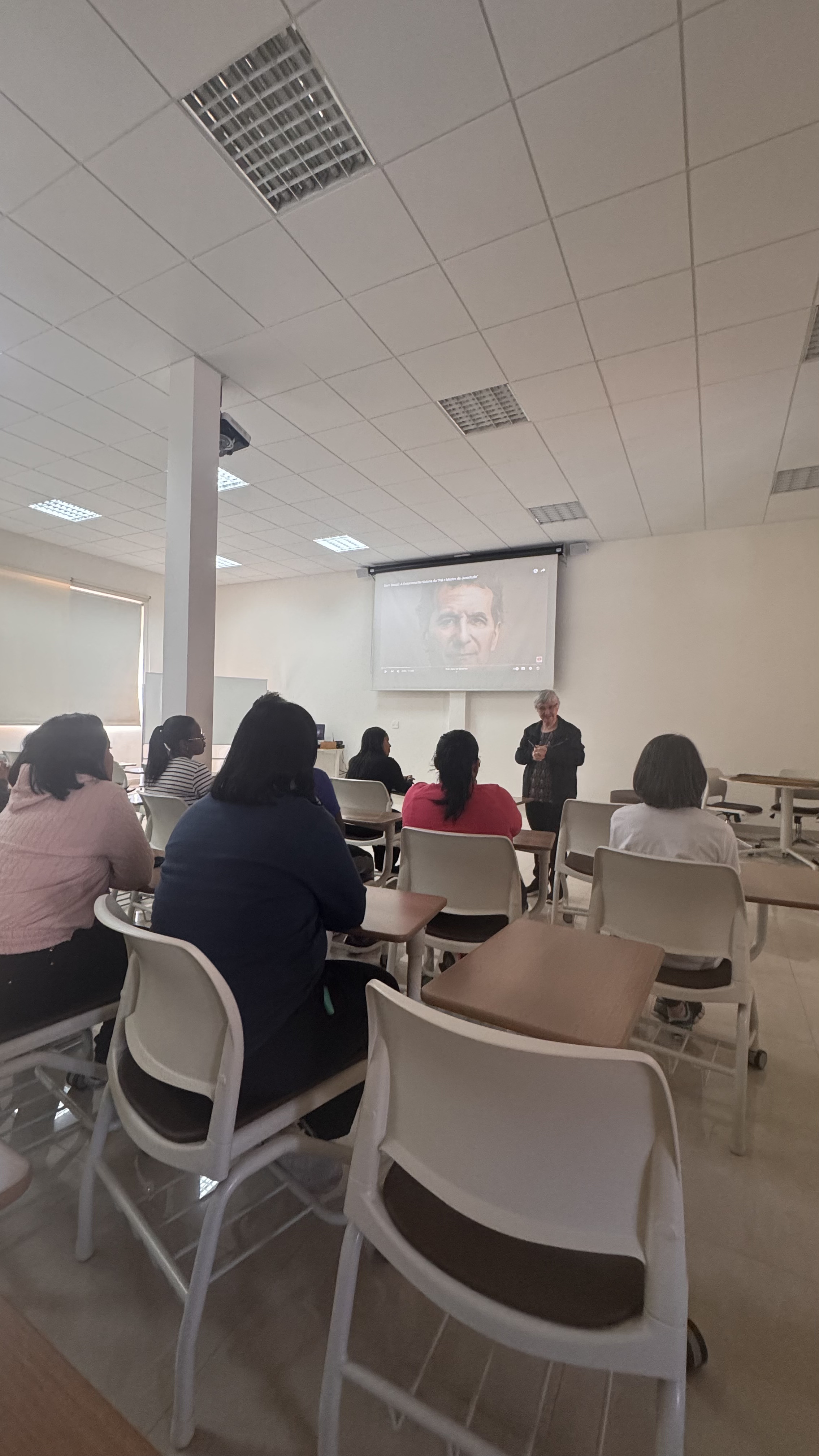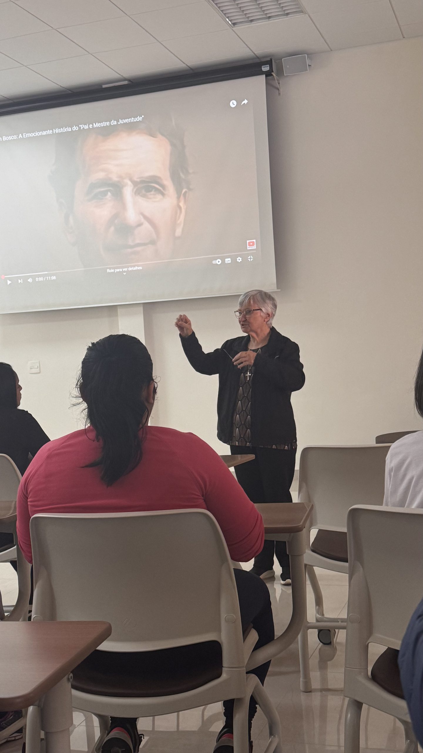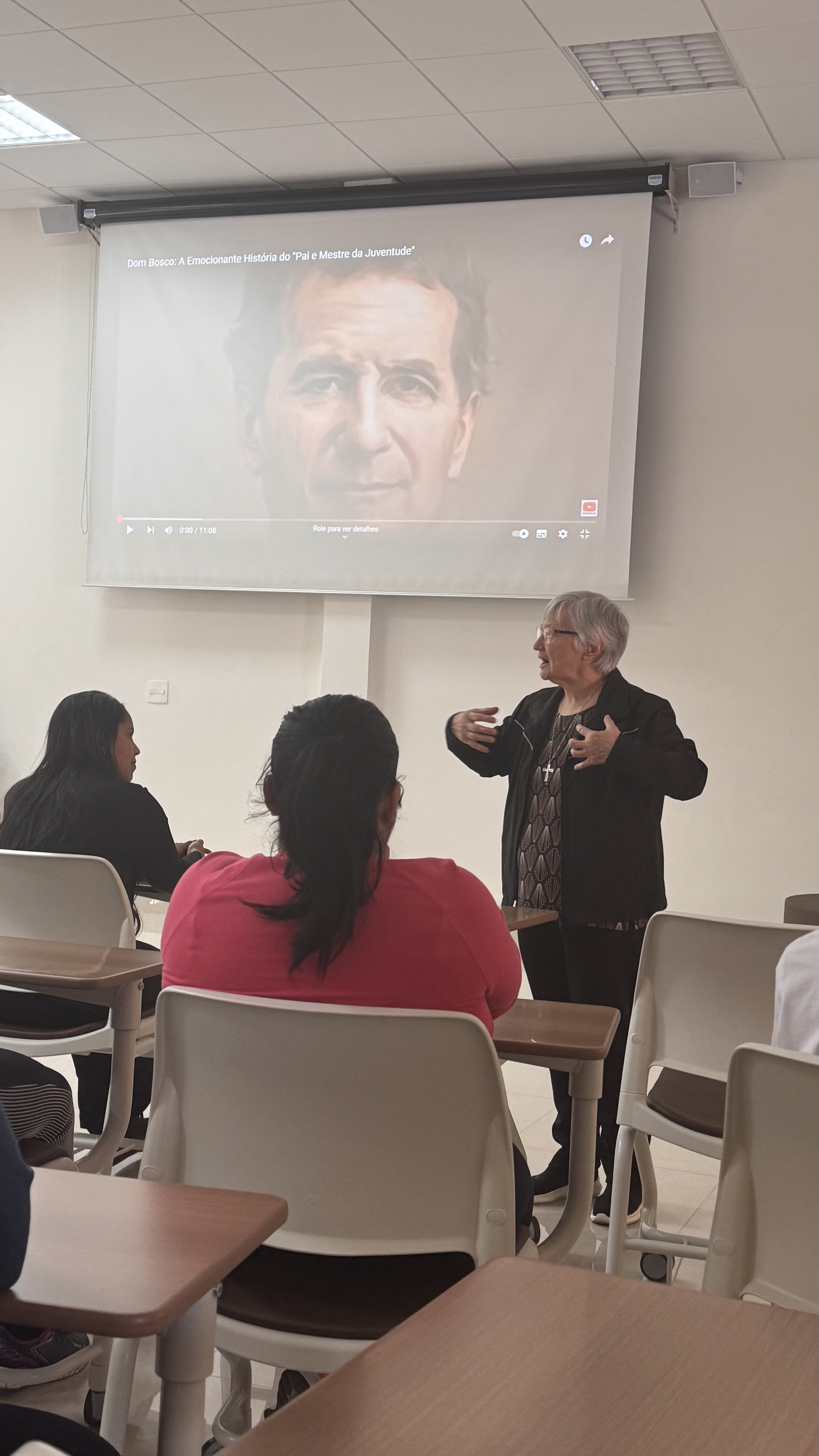 Durante o encontro, os educadores assistiram a um vídeo que apresentou a trajetória desses dois grandes fundadores, aprofundando o conhecimento sobre a vida e a missão que os uniu. Irmã Helena destacou aspectos essenciais da caminhada de Dom Bosco e de Madre Mazzarello, como a fé inabalável, a pedagogia do Sistema Preventivo — baseada na razão, na religião e na amabilidade — e a convicção de que todo educador é chamado a ser presença amiga, referência segura e inspiração para os jovens.