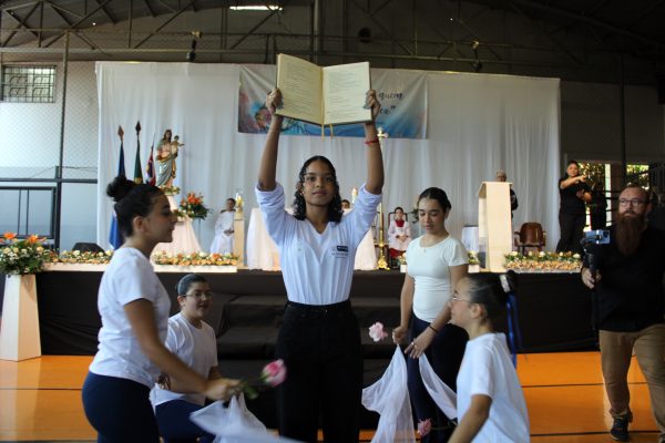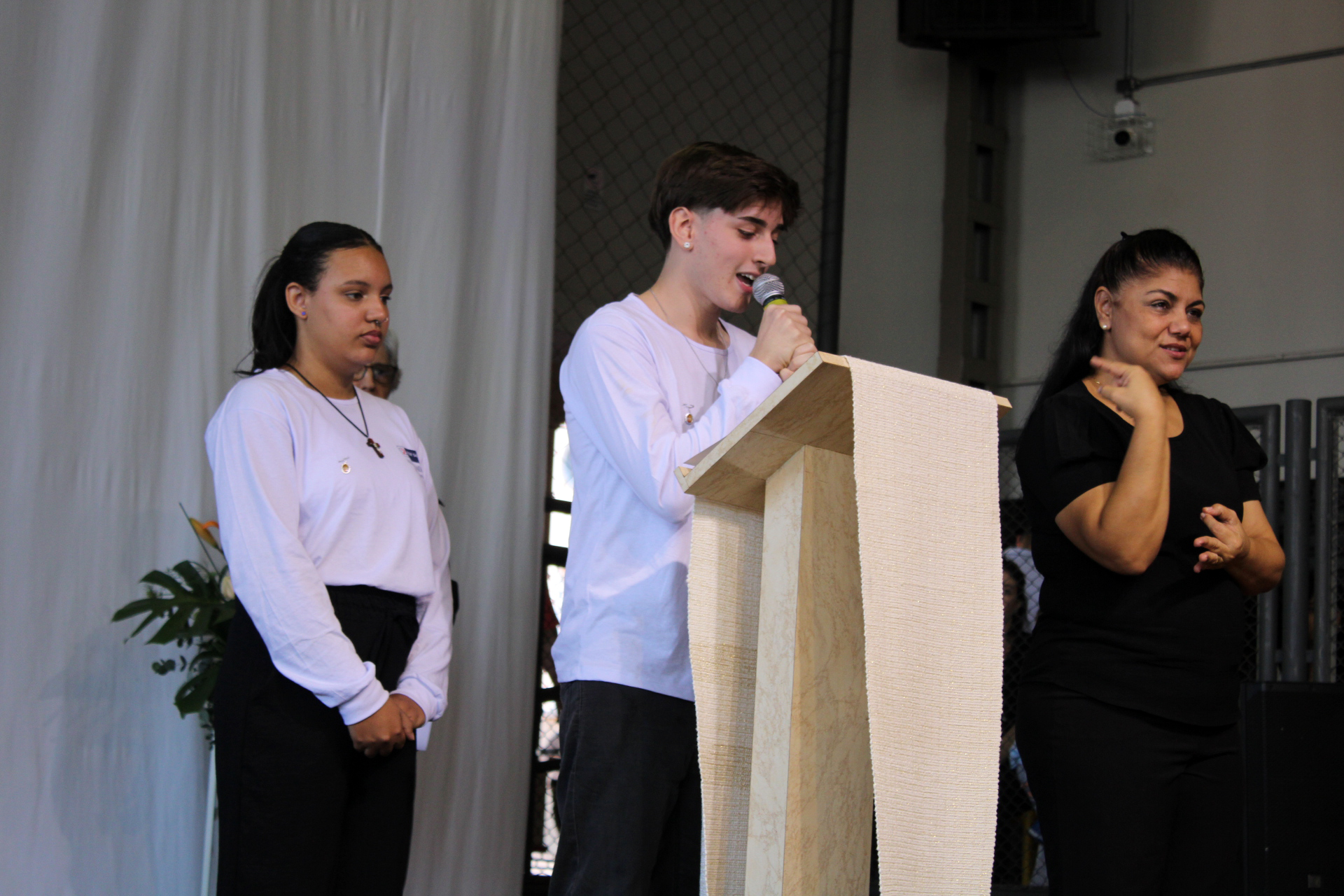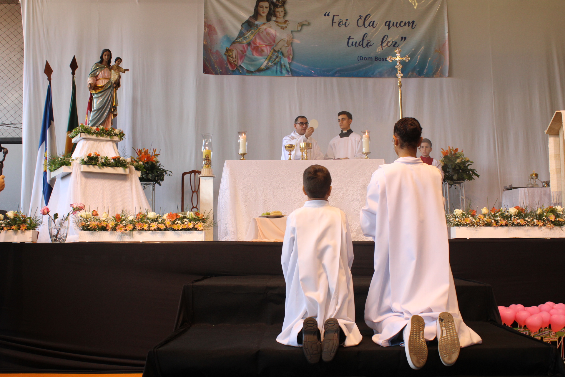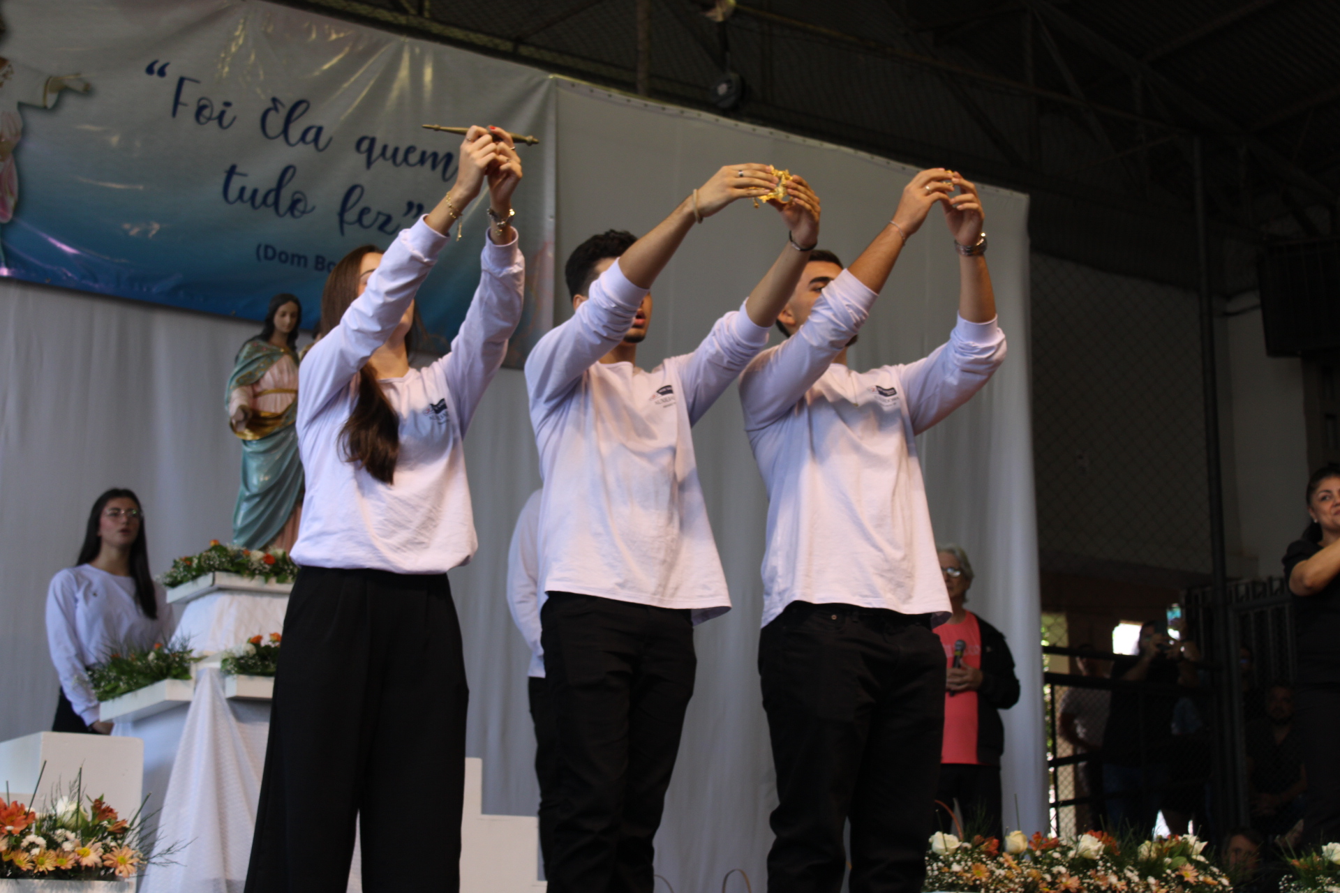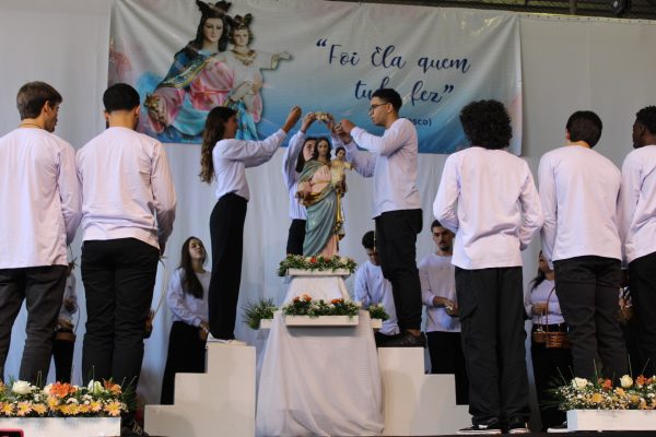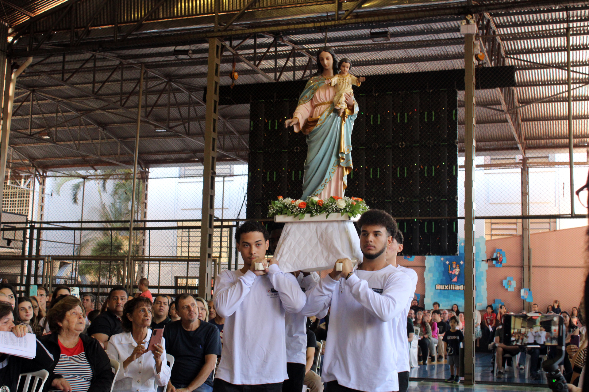 A celebração teve início com as palavras de acolhida da diretora, Luciana Orsini, e do professor de Teatro, José Maurício Cagno, comentarista do dia. Em seguida, estudantes da 3ª série do Ensino Médio conduziram a imagem de Nossa Senhora Auxiliadora até o palco, embalados pelo canto da música “Mãezinha do Céu”, interpretada por um coral de crianças do Ensino Fundamental Anos Iniciais.