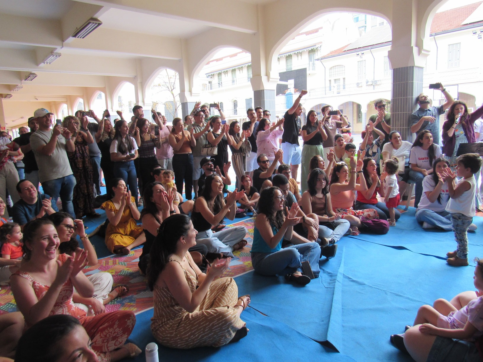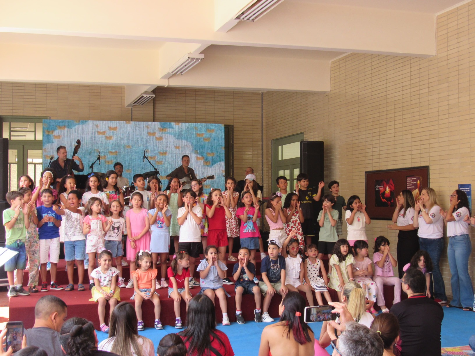 Logo após essa dinâmica entre banda, crianças e familiares, chegou a parte mais esperada por todos: os estudantes subiram ao palco para apresentar, junto com a banda, algumas das canções do projeto e também músicas em língua inglesa, selecionadas e ensaiadas pelos professores do Programa de Educação Bilíngue do Colégio. O público sorriu, cantou junto e se emocionou ao acompanhar a evolução de cada criança durante o processo.