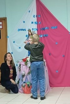 Para encerrar a Celebração, antes da bênção final, os educandos se organizaram ao redor da imagem de Nossa Senhora Auxiliadora e, ao som da música Te coroamos, “Ela quem tudo fez” foi coroada.