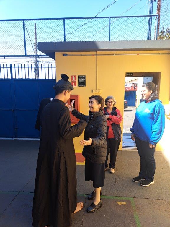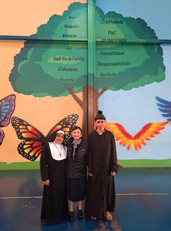 No período da tarde, foi acolhida pelos educandos. Dois deles interpretaram Madre Mazzarello e Dom Bosco durante a recepção. Em seguida, após a fala da Irmã Valentina, as crianças e adolescentes apresentaram o Hino da OSAF e uma dança temática sobre Maria, Mãe de Jesus, e os sonhos. Foi um momento muito animado, e a Irmã Paola trouxe uma mensagem importante para os educandos, instigando-os a pensarem sobre seus sonhos e a importância de estar com o coração aberto ao carisma salesiano.
