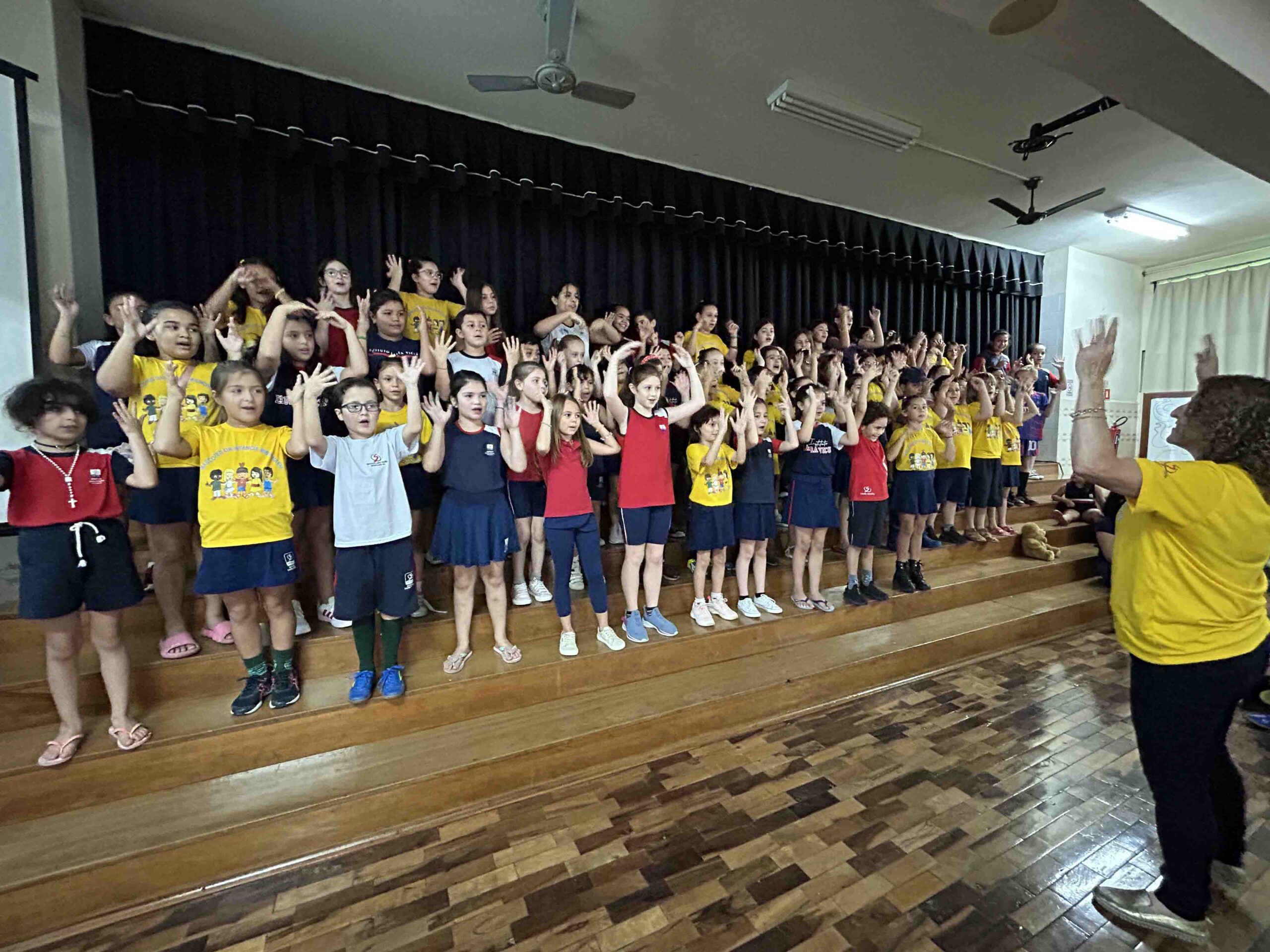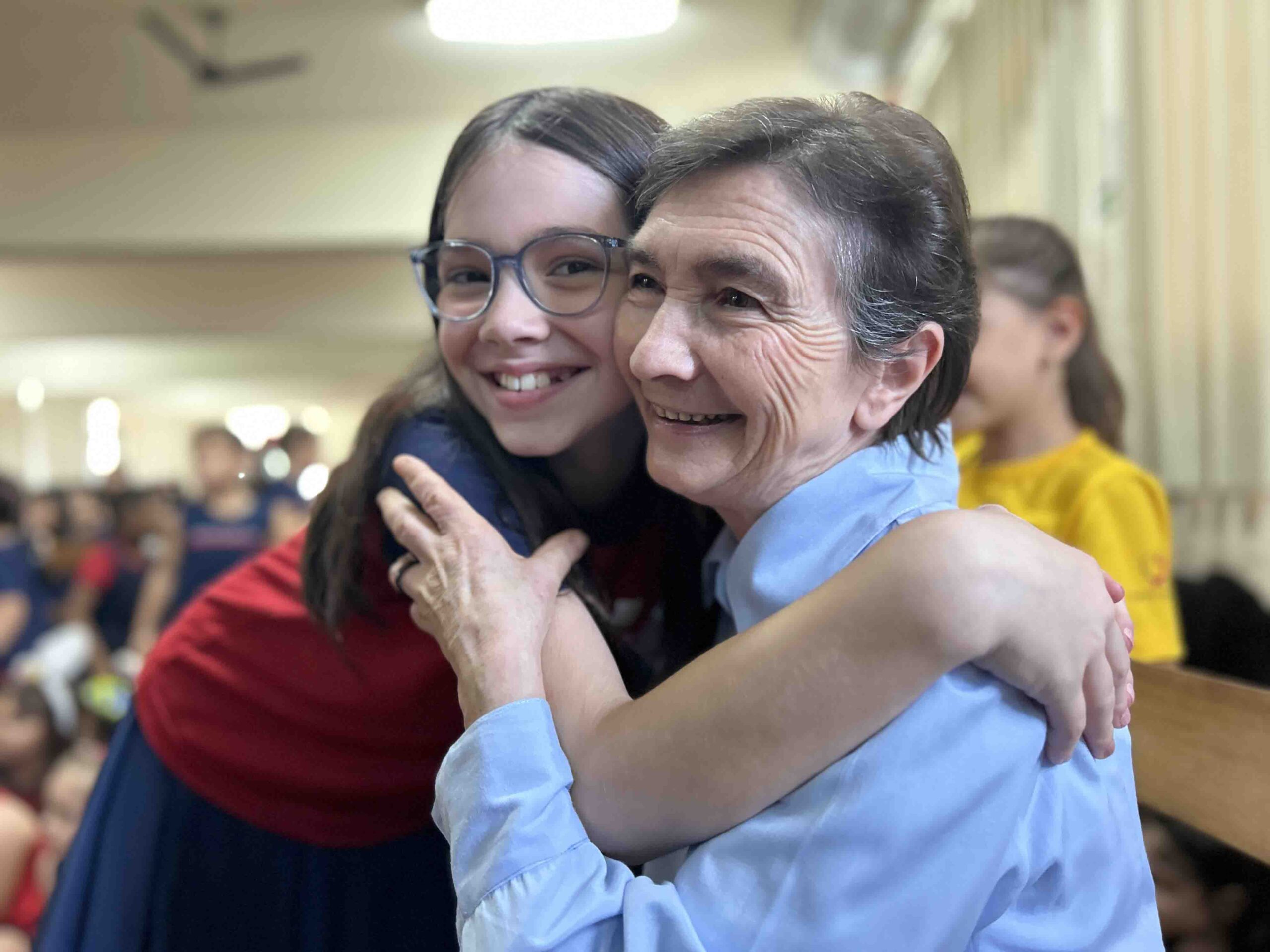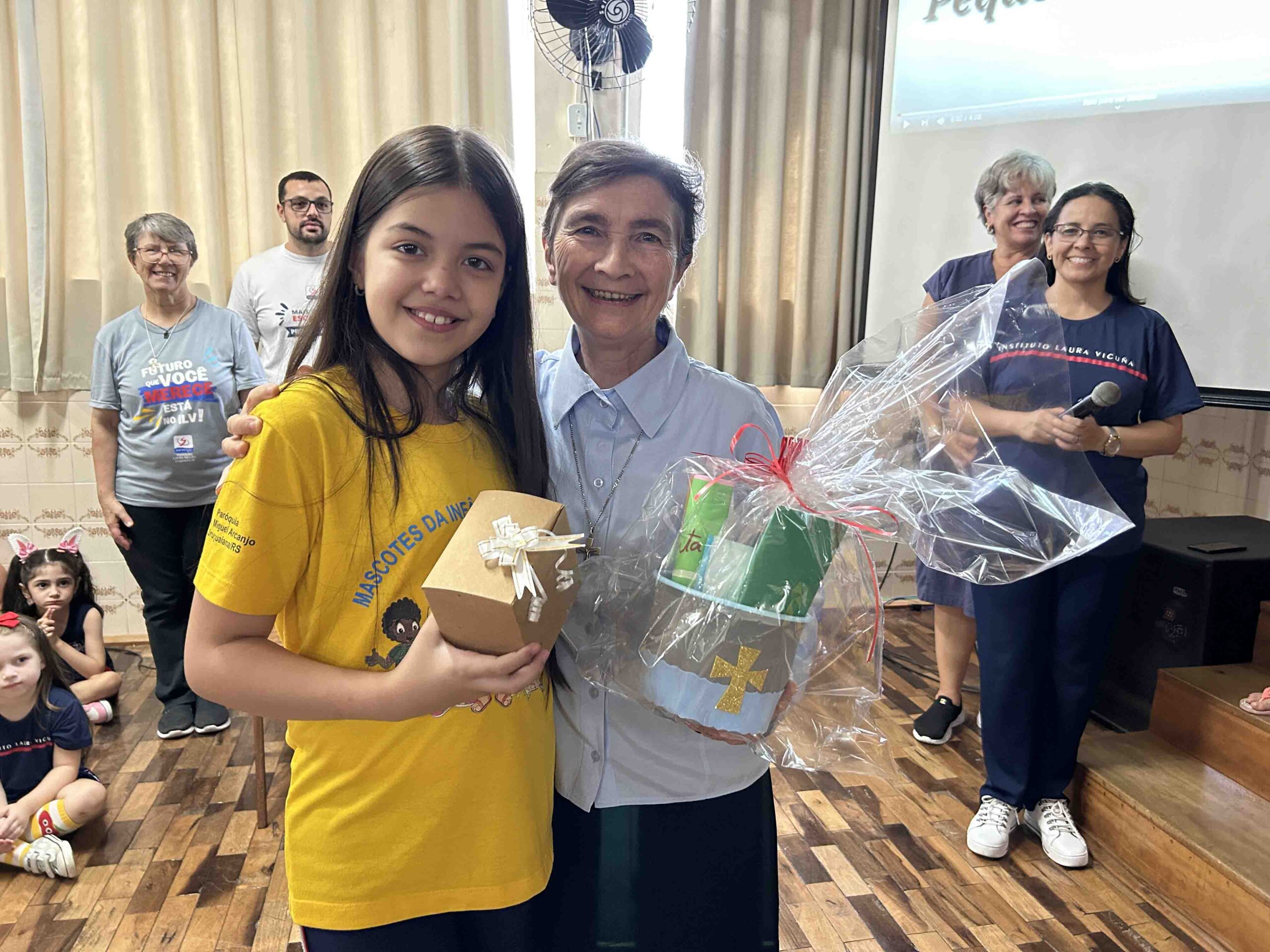 Com sorrisos radiantes e corações transbordando de gratidão, as crianças da Educação Infantil e do Ensino Fundamental I encantaram a tarde no Salão de Atos da escola, cantando a música “Pequenas Alegrias”. Em seguida, uma lembrança foi entregue à Irmã Paola pelas mãos de duas crianças.