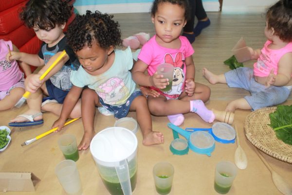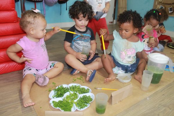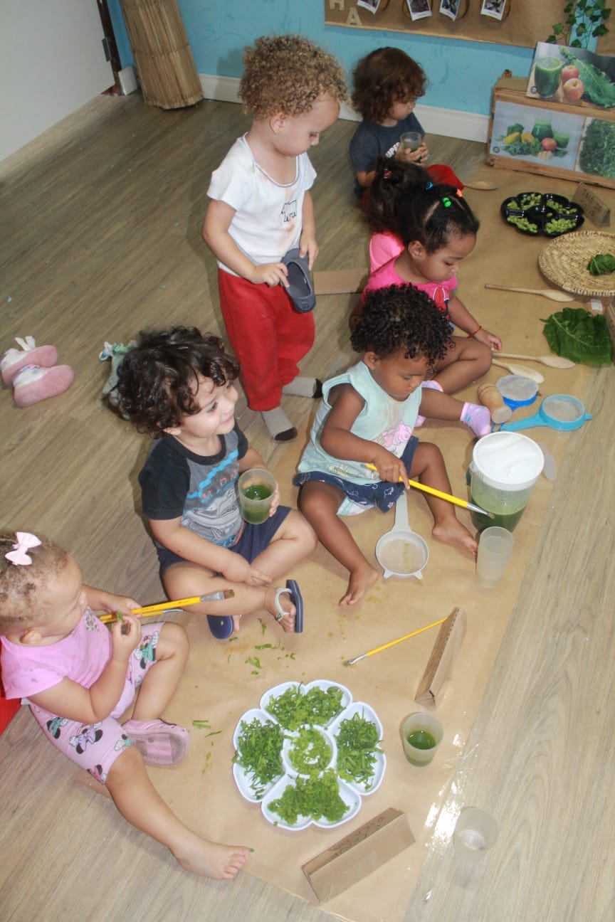 Explorando de diversas formas a couve (picada, cozida em folhas e suco) descobriram a pigmentação, ao utilizá-la como tinta natural. Houve a socialização entre pares, relacionando-a com objetos e aprendendo pelas próprias experiências.