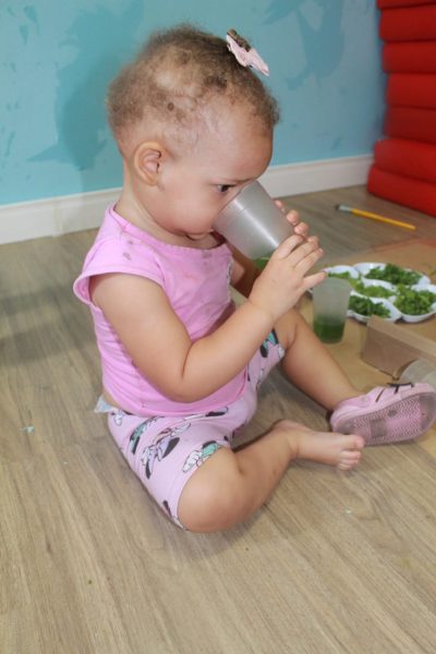 Logo, as crianças foram explorar. Duas delas pegaram o pincel, molharam na tinta natural e, com muita desenvoltura, pintaram no Kraft; outras duas pegaram a folha cozida, uma levou-a à boca e fez uma carinha de quem não gostou muito; outra pegou, sentiu sua textura e seu cheiro; uma criança pegou o suco, segurou em uma das mãos, pegou outro copo e brincou de fazer a transferência do líquido de um recipiente para o outro; outras duas experimentaram o suco tendo reações diferentes: uma tomou e parece ter gostado do suco, a outra fez carinha de quem não apreciou muito o sabor.
