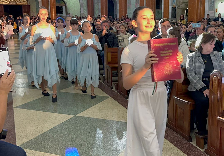 As crianças do Infantil 3 se fizeram presentes, acenando com bandeirinhas no corredor principal, garantindo o clima festivo. Uma família do Colégio Dom Bosco e outra do IMA também participaram trazendo as oferendas para o ofertório da Missa.