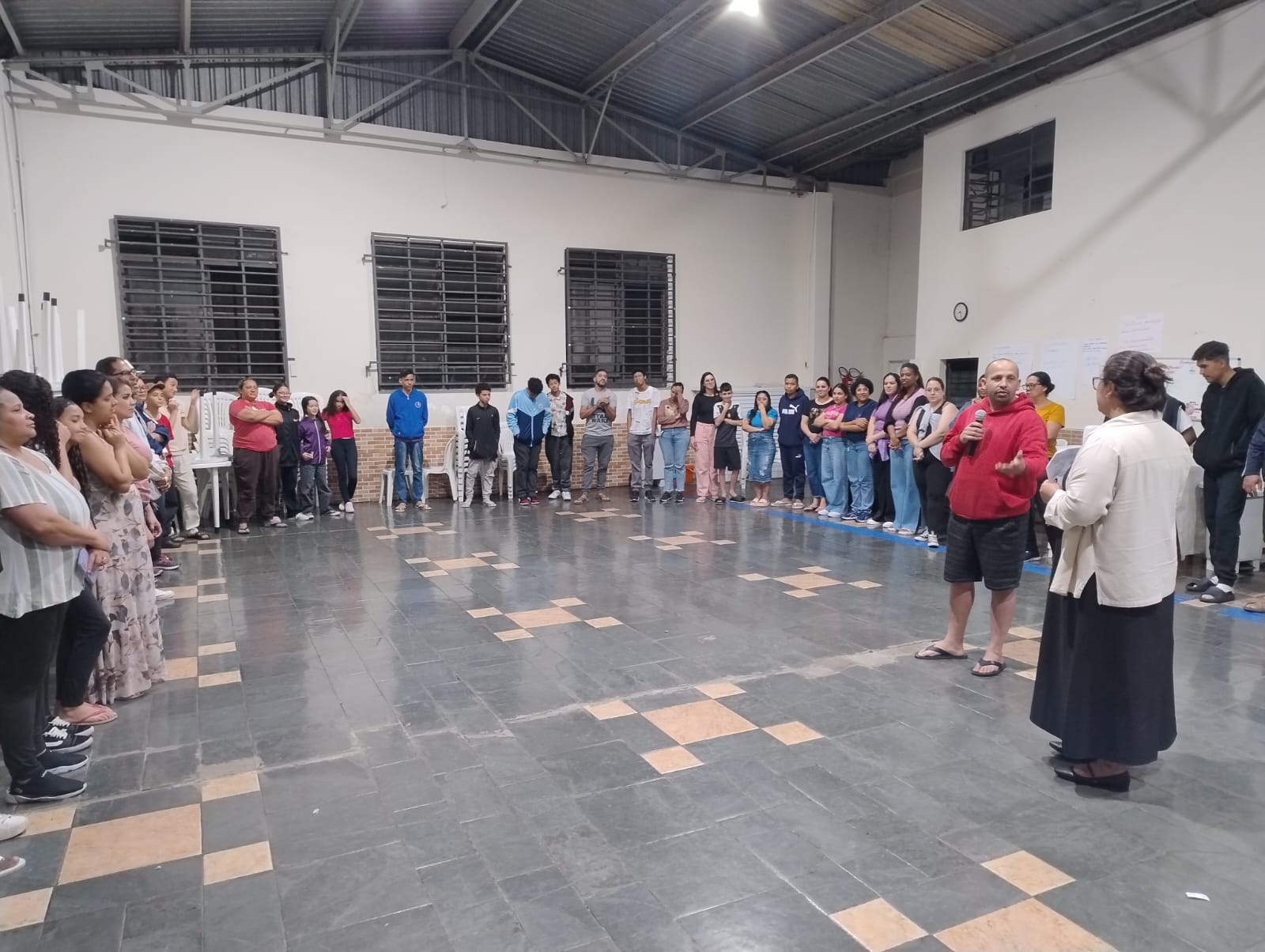 Entre as atividades, destacou-se uma dinâmica de integração em que grupos mistos foram formados para encontrar pontos em comum, favorecendo a aproximação de forma leve e descontraída. Em seguida, os educadores conduziram uma fala reflexiva sobre os principais desafios da adolescência hoje: influência das redes sociais, saúde emocional, riscos externos e conflitos familiares.