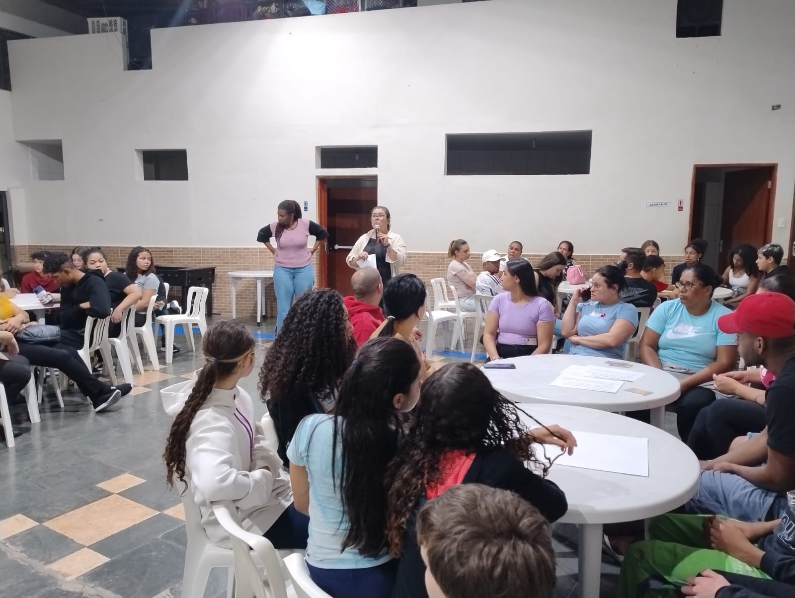 A atividade teve início com uma ambientação diferenciada: todos os participantes foram recebidos com uma encenação que simulava o “caos” vivido pelos adolescentes em seu cotidiano, marcado pelo excesso de estímulos, informações desencontradas e pressões diversas. A intenção foi gerar estranhamento e abrir espaço para a reflexão sobre como essas situações impactam a convivência familiar e o desenvolvimento dos jovens. Na sequência, o ambiente foi reorganizado com a colaboração de todos e os educadores convidaram os presentes a sentar e dialogar. Foi apresentada a proposta do encontro: criar um espaço de escuta, troca de experiências e construção conjunta entre adolescentes, famílias e CCA.