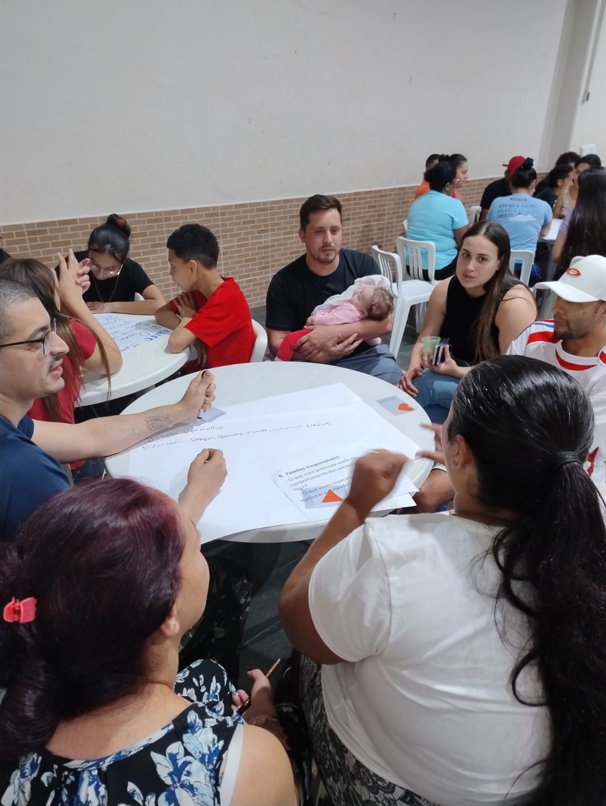 O momento mais rico aconteceu durante o trabalho em grupos, em que adolescentes e responsáveis responderam a perguntas sobre expectativas, preocupações e formas de apoio mútuo. As produções foram registradas em cartazes e coladas em um mural coletivo. As falas revelaram tanto preocupações comuns — como a influência dos amigos, o uso das redes sociais e a falta de diálogo — quanto desejos de aproximação, respeito e confiança entre famílias e jovens.