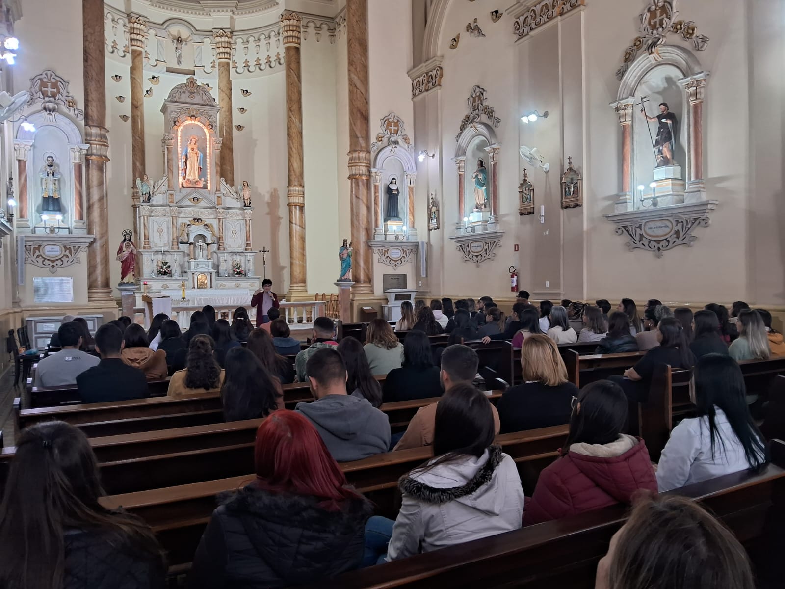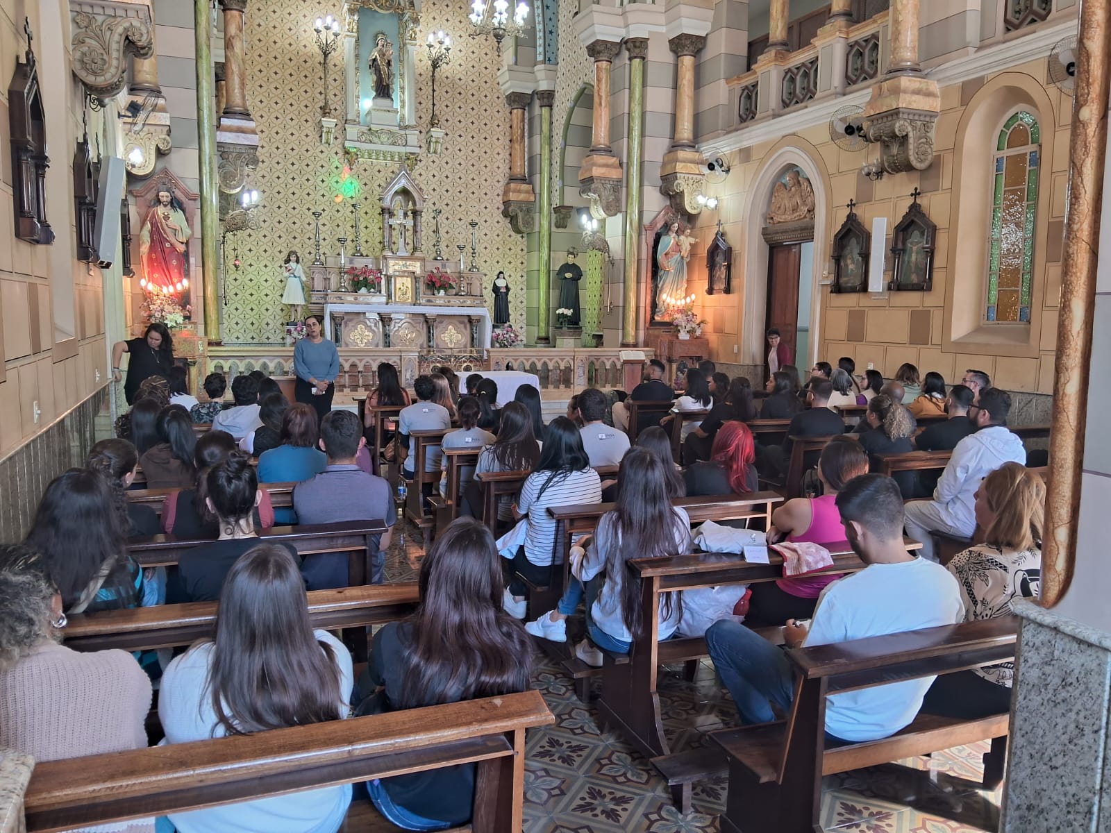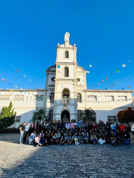 O dia começou na Casa do Puríssimo Coração de Maria, em Guaratinguetá (SP), onde 80 participantes foram recebidos calorosamente pela equipe organizadora, que preparou um delicioso café da manhã. A Diretora Presidente da AEISSP, Irmã Teresa Cristina Pisani Domiciano, expressou suas carinhosas boas-vindas na capela, acompanhada por Irmã Silvana Soares, Vice-Reitora do Centro Universitário Teresa D’Ávila - UNIFATEA, Meily Cassemiro Santos, Gestora Pedagógica AEISSP, Stefanny dos Passos de Souza, Gestora Administrativa AEISSP e pela presença simbólica de Madre Mazzarello (Maín), representada por Isadora Lina, Assessora inspetorial de Pastoral Juvenil.
