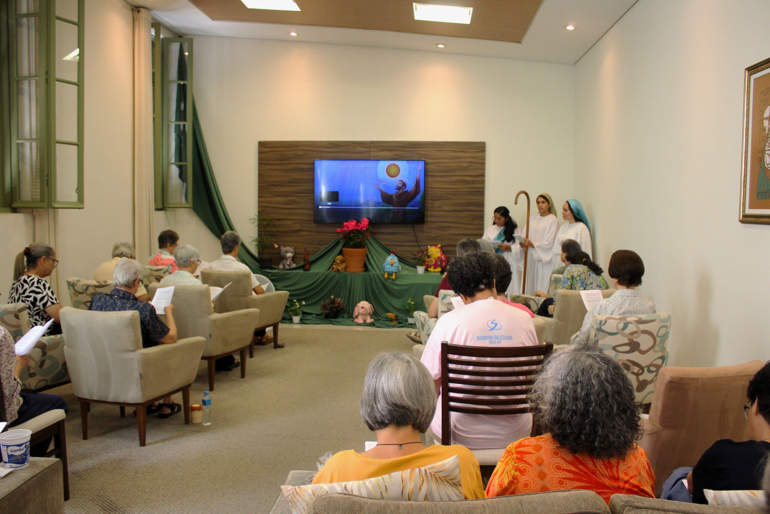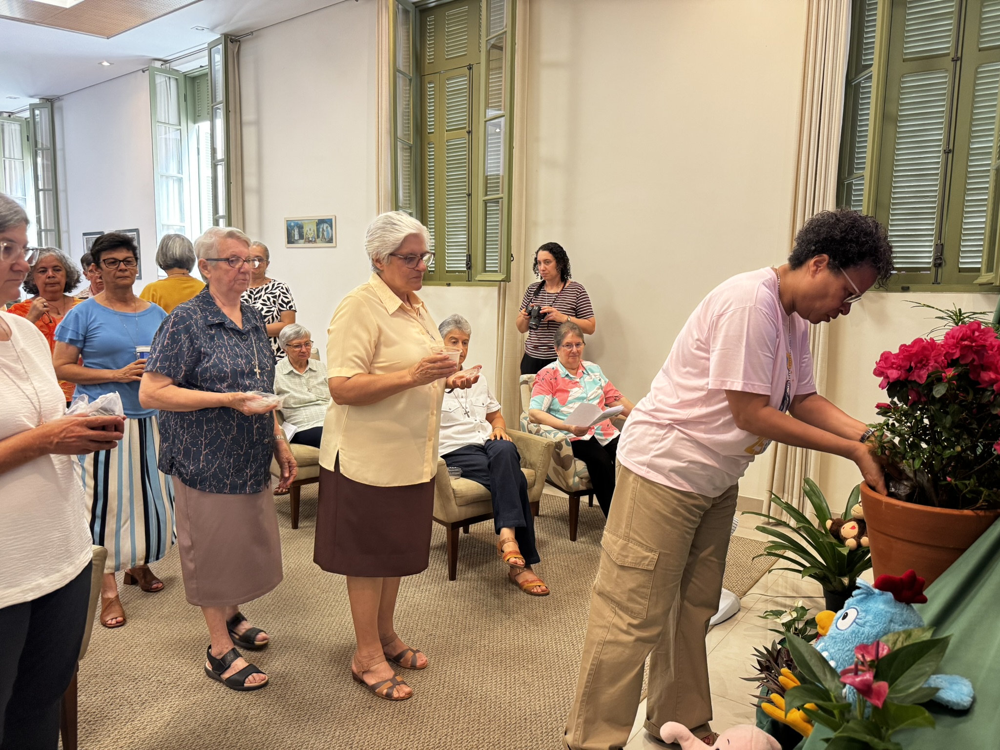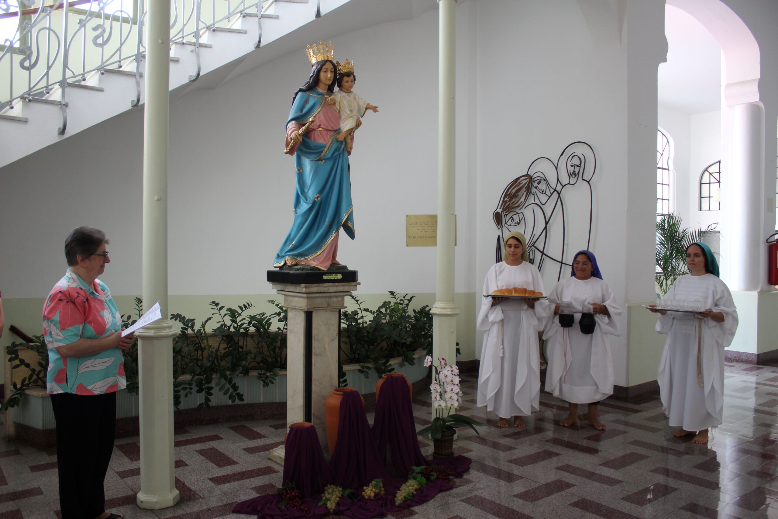 Caminhamos para a partilha: a partilha do pão e do vinho, na solidariedade dos três personagens, com o movimento único pairando e conduzindo toda a comunidade em oração para o momento mais alto, ou seja, celebrativo do dar, do sair, do caminhar para terras distantes e para o momento profundo. Aqui tivemos a alegria de partilhar a terra: a terra de onde viemos, a terra onde trabalhamos, onde desenvolvemos a nossa missão. Terra essa que frutifica a semente do trabalho e germina a Palavra de Deus, o Evangelho que está no coração de cada uma de nós, como consagrada, e também dos nossos colaboradores, dos nossos destinatários, crianças e jovens. Agradeço ao Senhor por esse momento. Agradeci e continuo nesse momento de ação de graças por esta manhã. Obrigada, Irmã Solange e equipe, por esse momento, por essas jovens que tão bem representaram, tão bem transmitiram a Palavra, o gesto e o amor».
