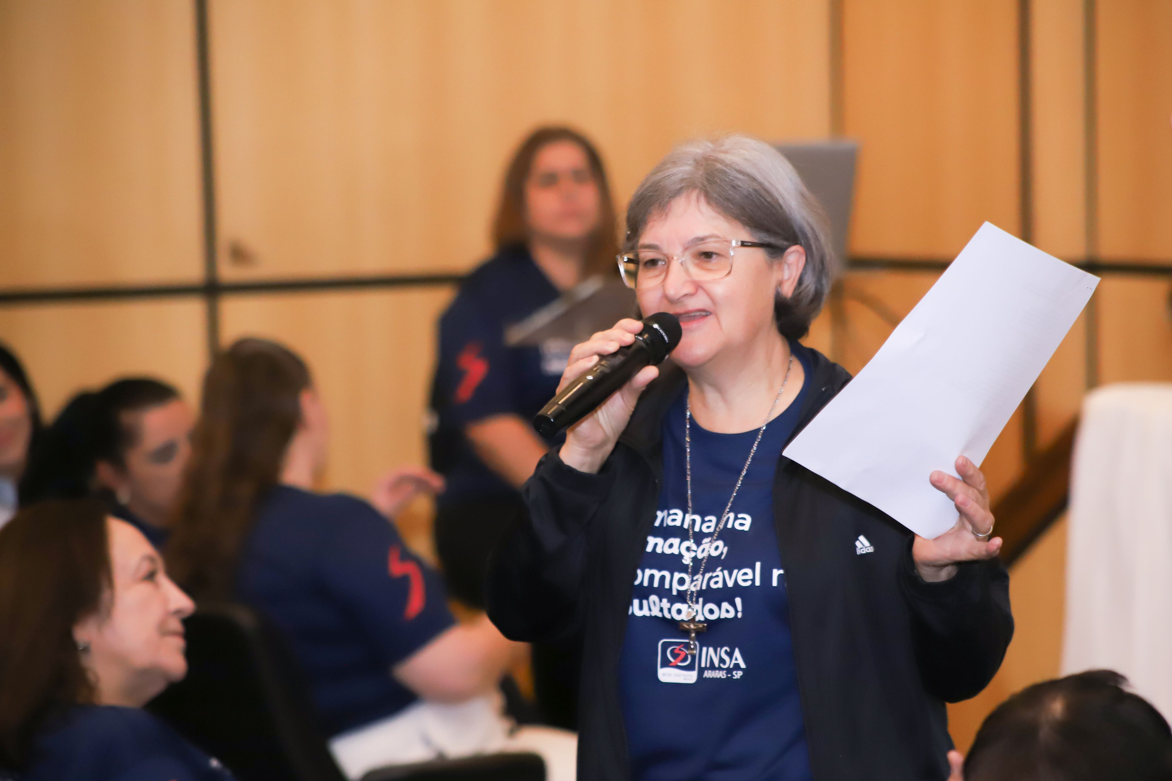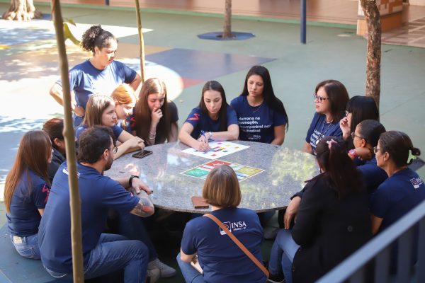 De volta ao teatro, os colaboradores foram divididos em oito grupos para a dinâmica da flor de lótus, refletindo sobre pilares que sustentam a missão do INSA: excelência acadêmica, tradição e inovação, formação integral, integração escola-família, escola em pastoral, mediação de conflitos, infraestrutura e acolhimento. As ideias levantadas pelos grupos foram socializadas, ampliando a visão de comunidade educativa.