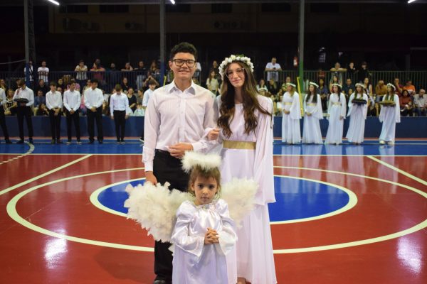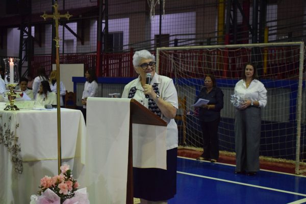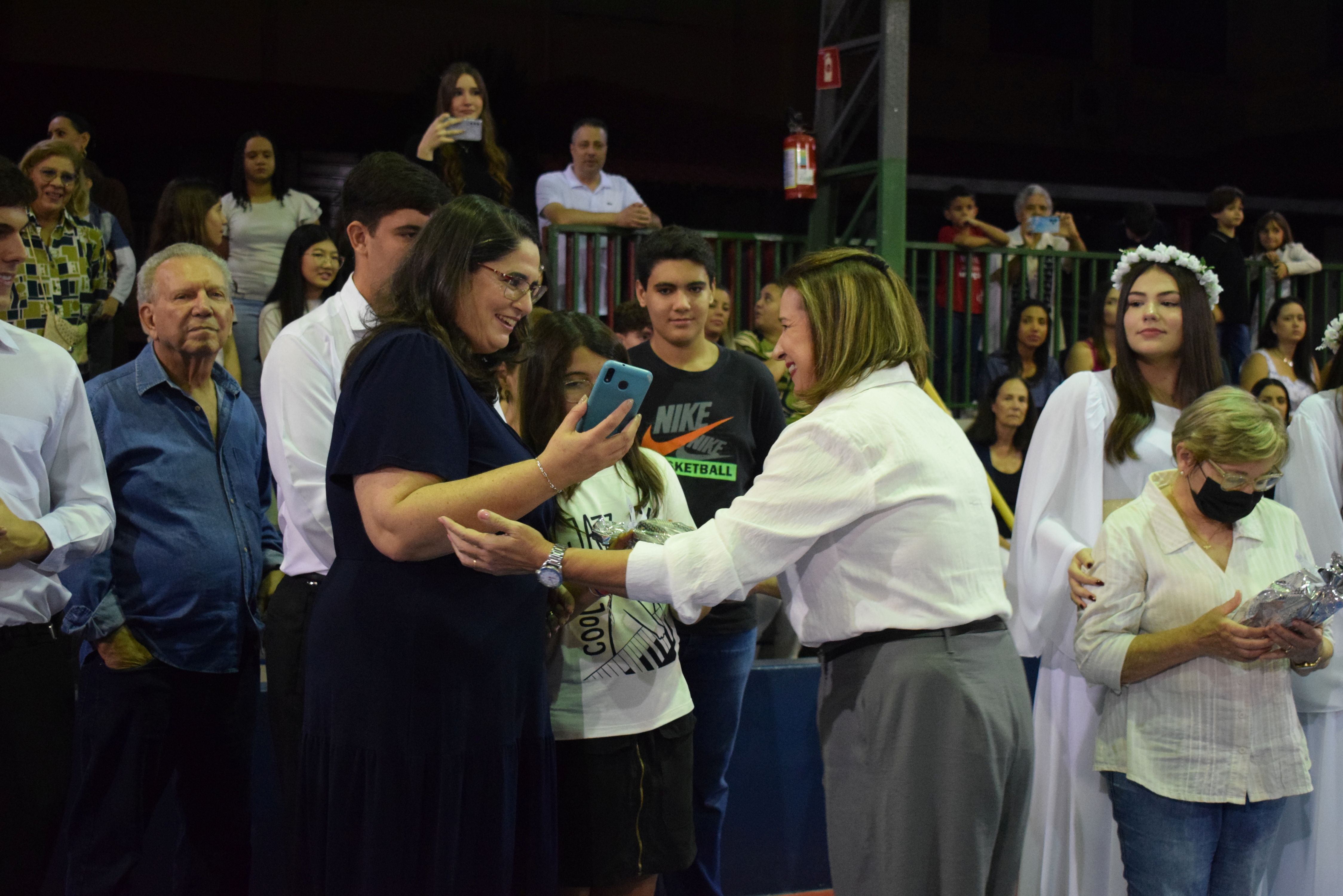 Durante o evento, a diretora institucional, Irmã Ivone Yared, dirigiu uma saudação aos presentes, com a qual expressou agradecimentos às famílias pela confiança depositada na proposta educativa do CENSA. Em seguida, a diretora escolar, Katia, realizou a entrega de uma lembrança simbólica aos dois estudantes mais antigos, em reconhecimento à trajetória de ambos na instituição.