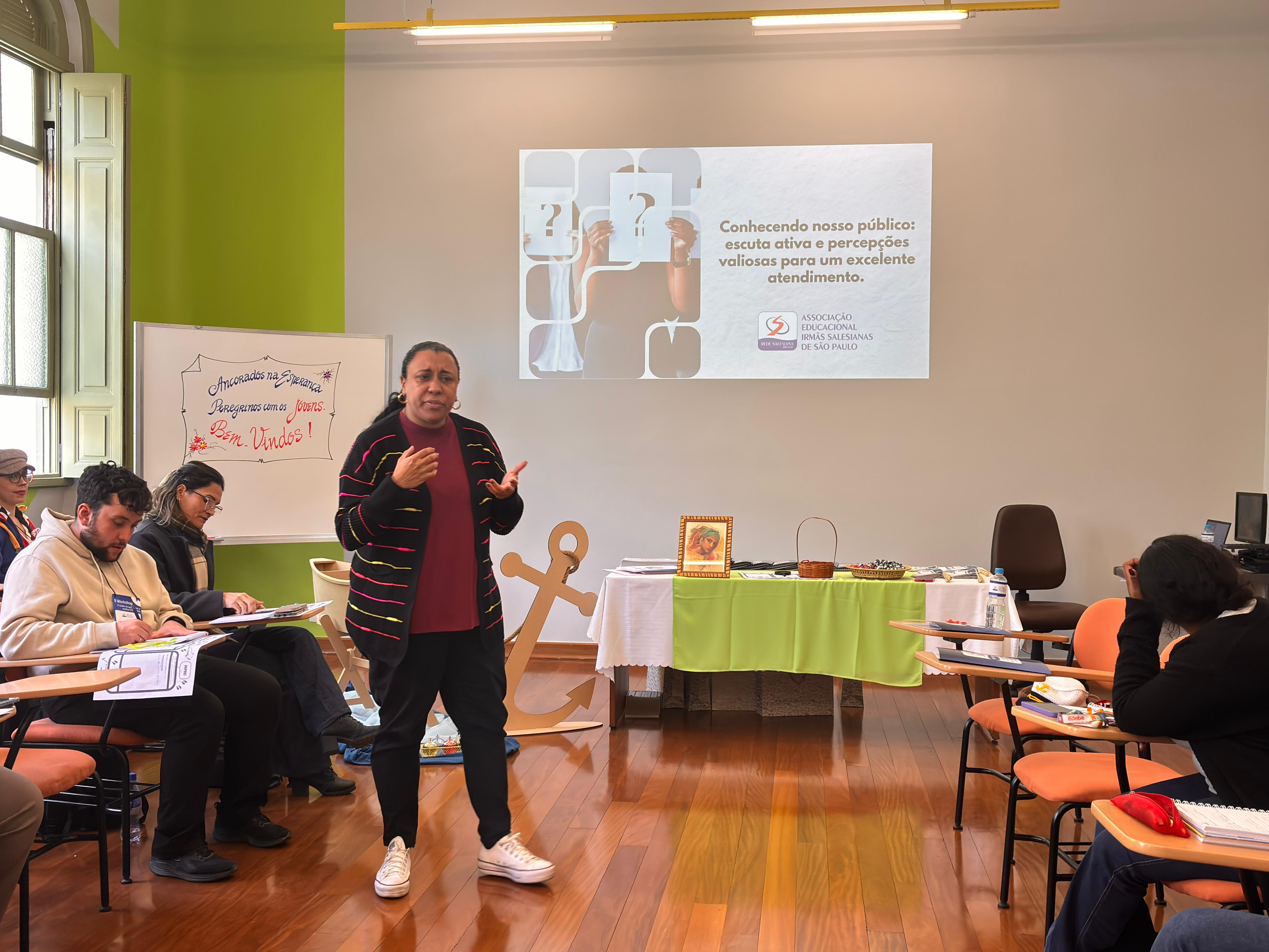 Durante a oficina Conhecendo nosso público: escuta ativa e percepções valiosas para um excelente atendimento, Andréa Pereira, Assessora de Marketing e Comunicação da AEISSP, iluminou a importância da escuta ativa como um pilar fundamental para elevar a qualidade do atendimento nas escolas salesianas. Com um olhar visionário, ela mostrou como a compreensão das necessidades e expectativas das famílias pode criar conexões profundas e significativas. Para engajar ainda mais os presentes, Andréa apresentou vídeos impactantes, gerados por Inteligência Artificial, em que os pais compartilhavam suas angústias e perguntas ao decidirem sobre a matrícula de seus filhos durante a visita em uma escola salesiana. Além disso, trouxe à tona fragmentos reais extraídos das visitas de "clientes ocultos", que forneceram reflexões e orientações cruciais sobre a experiência do atendimento.