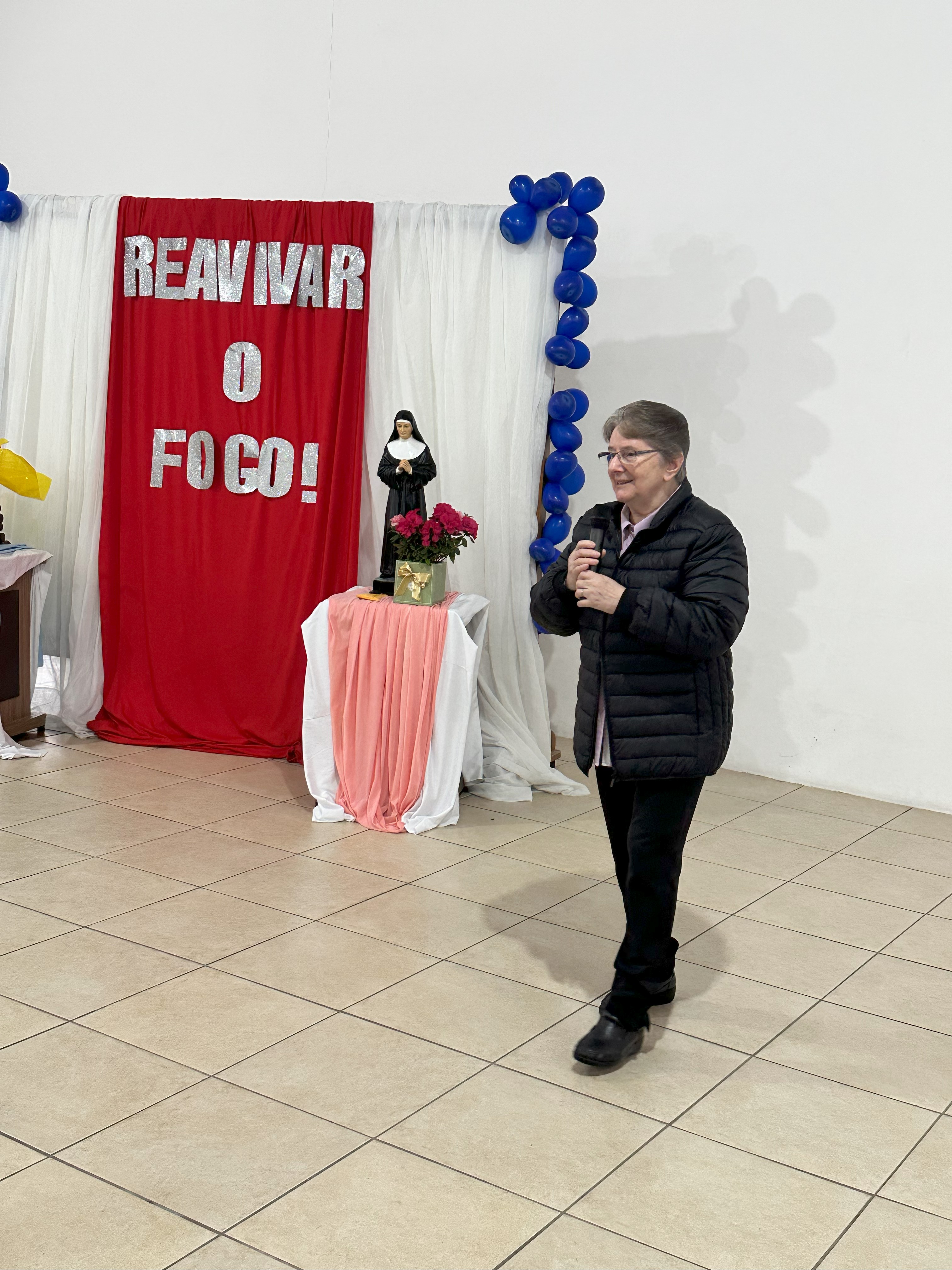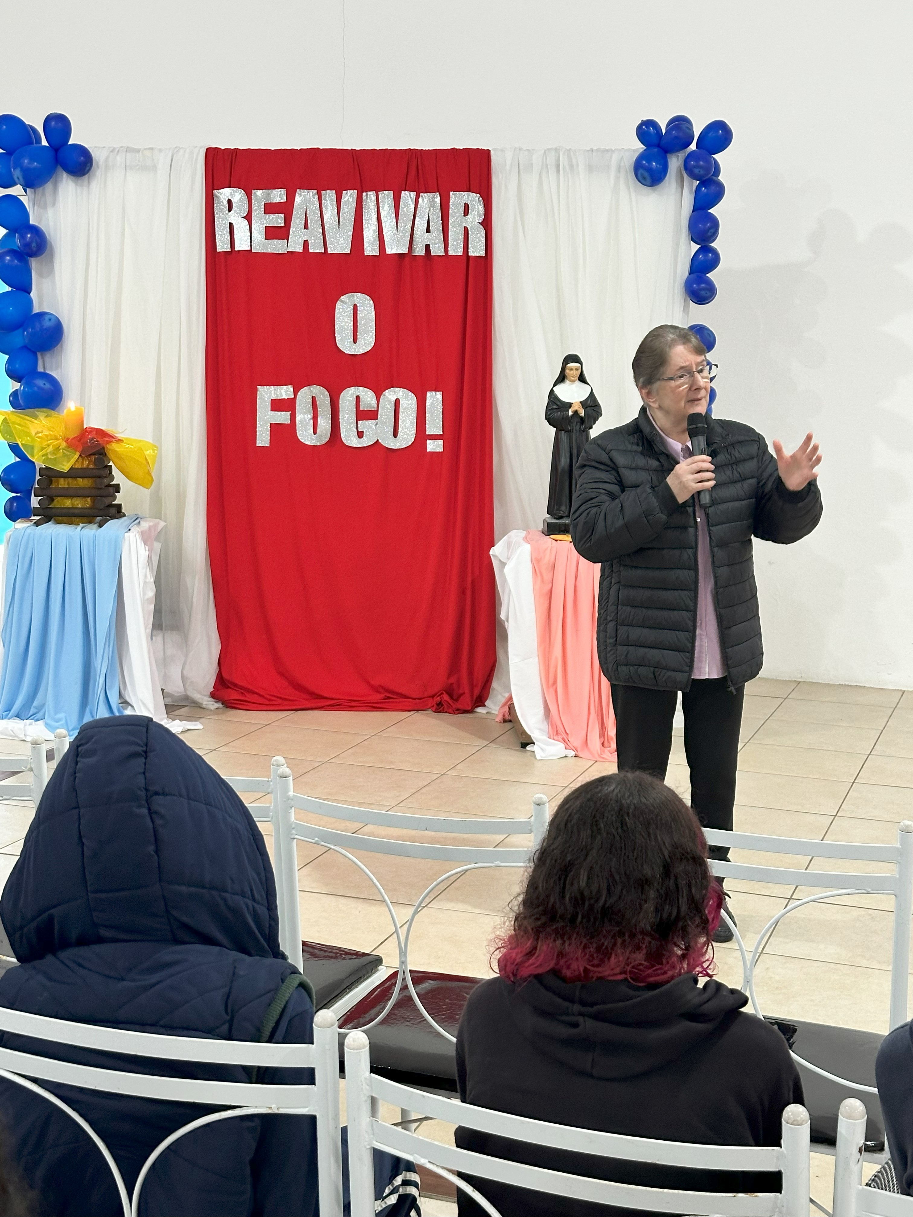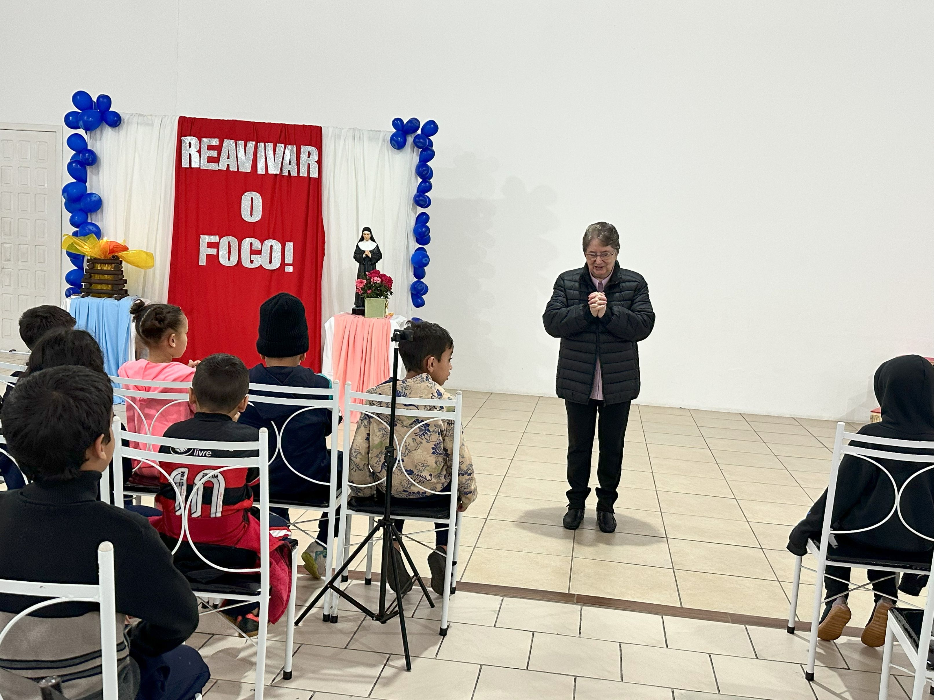 Em outro momento, a Inspetora reuniu-se com a equipe de colaboradores da Obra Social para um encontro especial. Irmã Alaíde recordou a primeira expedição missionária das Filhas de Maria Auxiliadora (FMA), que partiu da Itália para o Uruguai em 1877, e trouxe à reflexão o lema: «Agora é tempo de reavivar o fogo». Propôs então um momento de partilha e reflexão sobre a necessidade de reacender o fogo do carisma para continuar transformando vidas com alegria, amor e esperança.