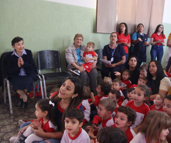 À tarde, o clima de acolhida continuou com uma segunda apresentação musical preparada pelos professores Emerson e Priscila. Este momento incluiu uma combinação de instrumentos musicais, canto e coreografia, proporcionando uma recepção calorosa e memorável para Irmã Paola.