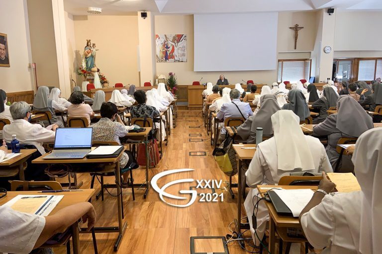 À tarde, com a invocação do Espírito Santo, inicia-se o tempo de silêncio e escuta da Palavra. A Madre Geral, Irmã Yvonne Reungoat, exorta as participantes a viver em profundidade este tempo de oração e de silêncio «na escuta do Espírito, atitudes indispensáveis para criar o melhor clima para que o Capítulo Geral XXIV seja orientado a uma busca sincera e apaixonada para o bem do Instituto, segundo o projeto de Deus, para renovar a fidelidade ao dom carismático que os Fundadores receberam e transmitiram”.