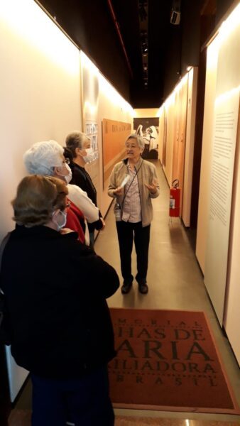 Acompanhada pela Ir. Dulce Hirata, responsável pelo acolhimento dos grupos, Ir. Adriana conheceu a gruta de Nossa Senhora de Lourdes, em seguida foi apresentada a toda infraestrutura do Memorial, com sua trajetória educativo-missionária por meio de um acervo rico em detalhes e registra sensorialmente nossa história nos aspectos afetivo, cultural e religioso.