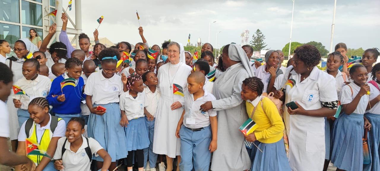 Nesta terça-feira (23), a Madre Geral do Instituto das Filhas de Maria Auxiliadora (FMA), Ir. Chiara Cazzuola, chegou ao Aeroporto Internacional de Maputo, em Moçambique, com as Inspetoras da Conferência CIAM de África e Madagáscar. A religiosa foi recebida por FMA, SDB, Ex-alunas e pelas Comunidades Educativas das presenças educativas do sul de Moçambique, tudo ao ritmo das danças tradicionais Xigubo e Galanga, contando com muitas palmas, tambores e cantorias.