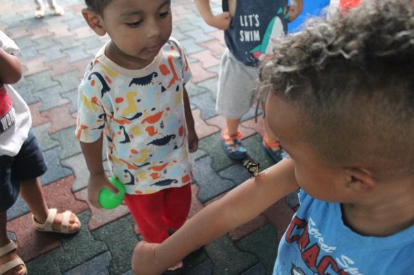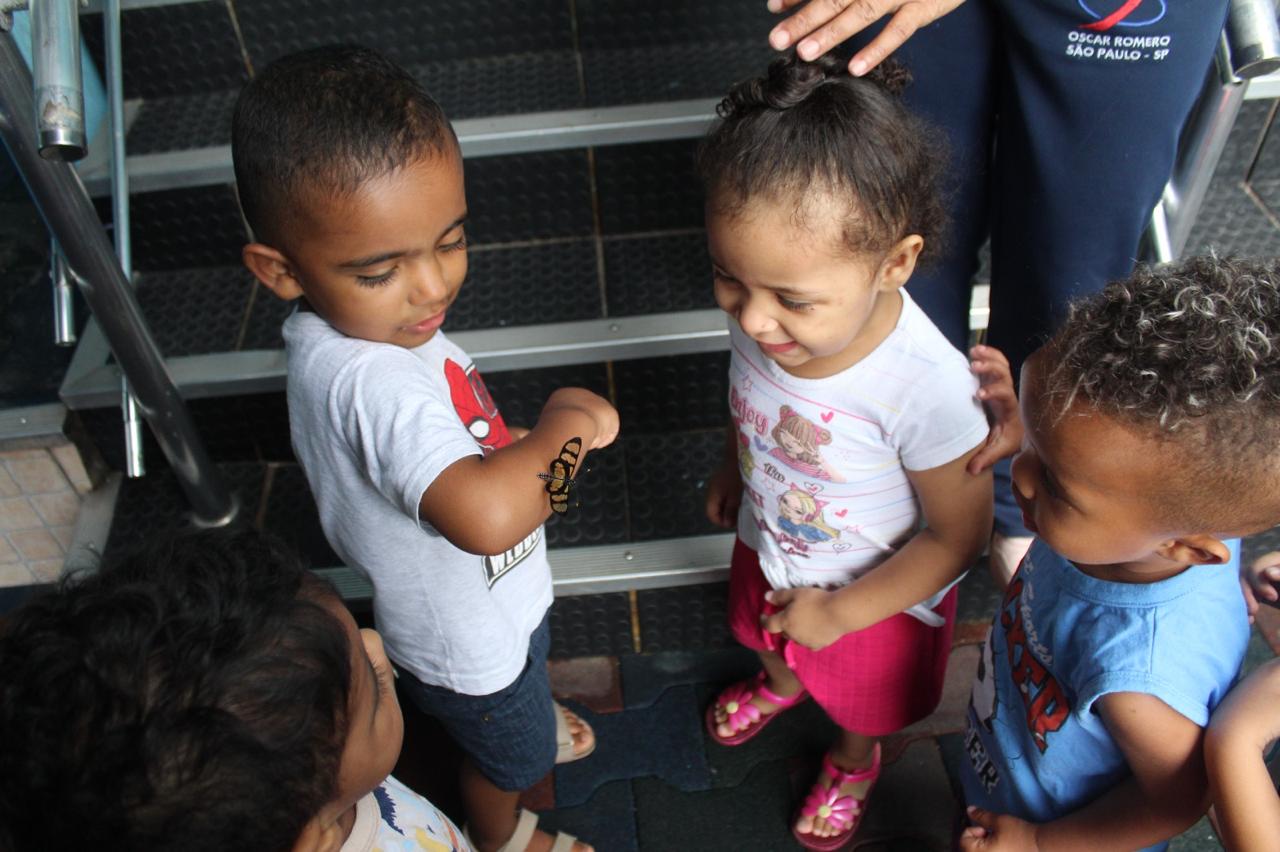 E a turminha cuidadosamente forma uma roda ao redor da borboleta e juntos a observam com atenção. Logo apresentaram-se três corajosos e pediram para segurá-la.