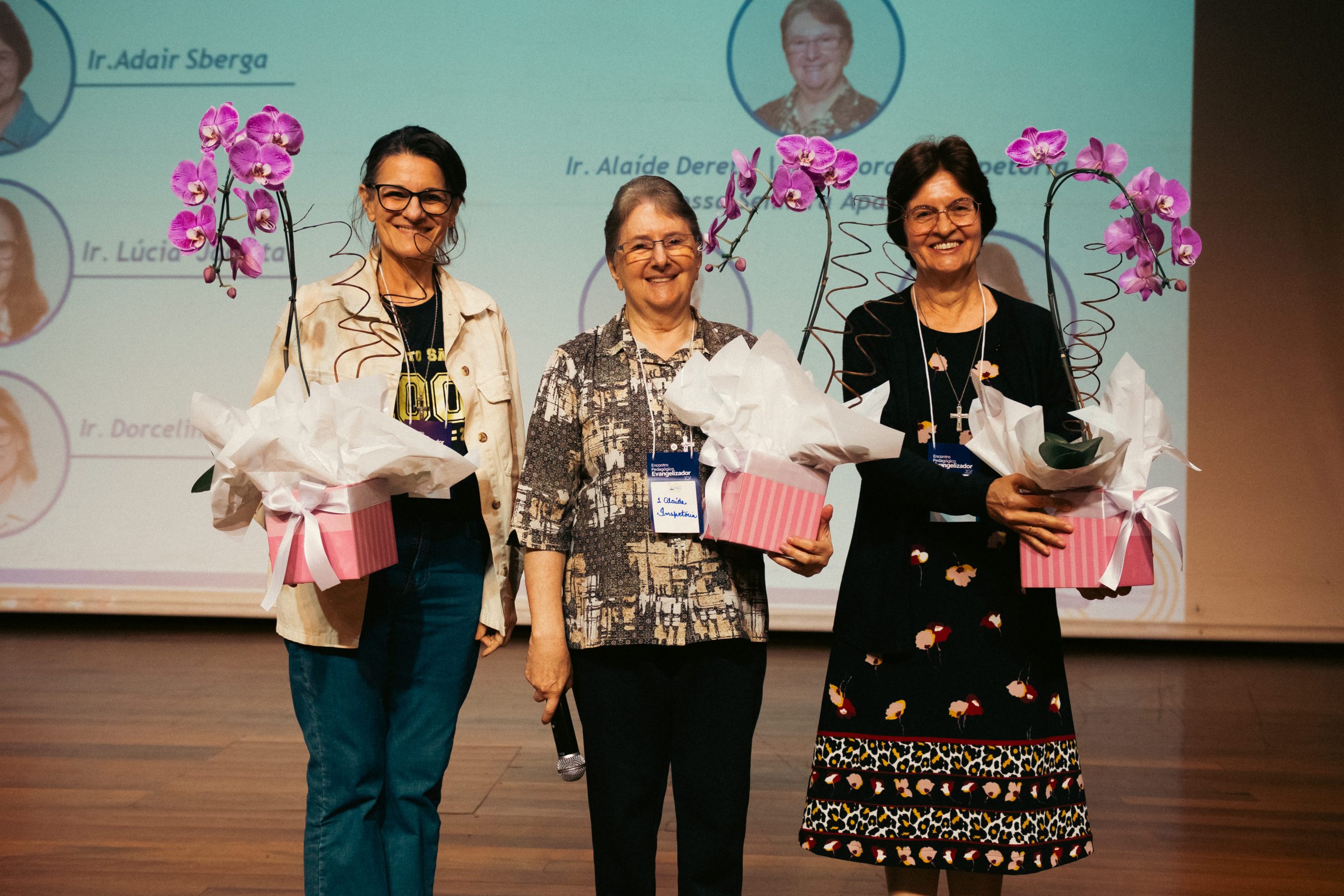 A programação teve início com o convite de Irmã Dorcelina Rampi, diretora-tesoureira da AEISSP, à Irmã Teresa Cristina P. Domiciano, então diretora-presidente da AEISSP, para a abertura das homenagens, estabelecendo um clima de reconhecimento pelo trabalho desenvolvido ao longo de sua gestão.