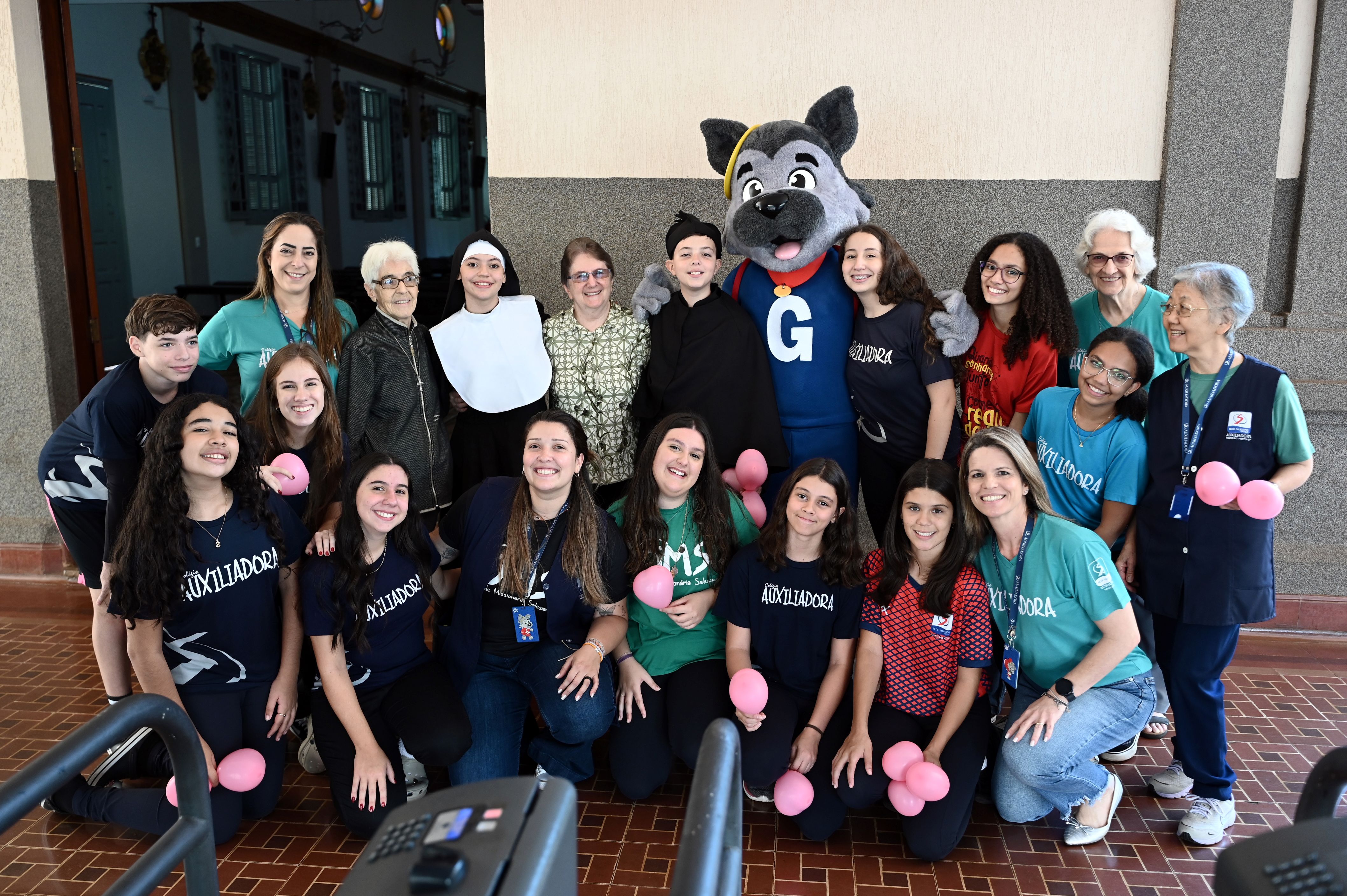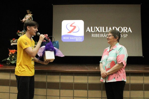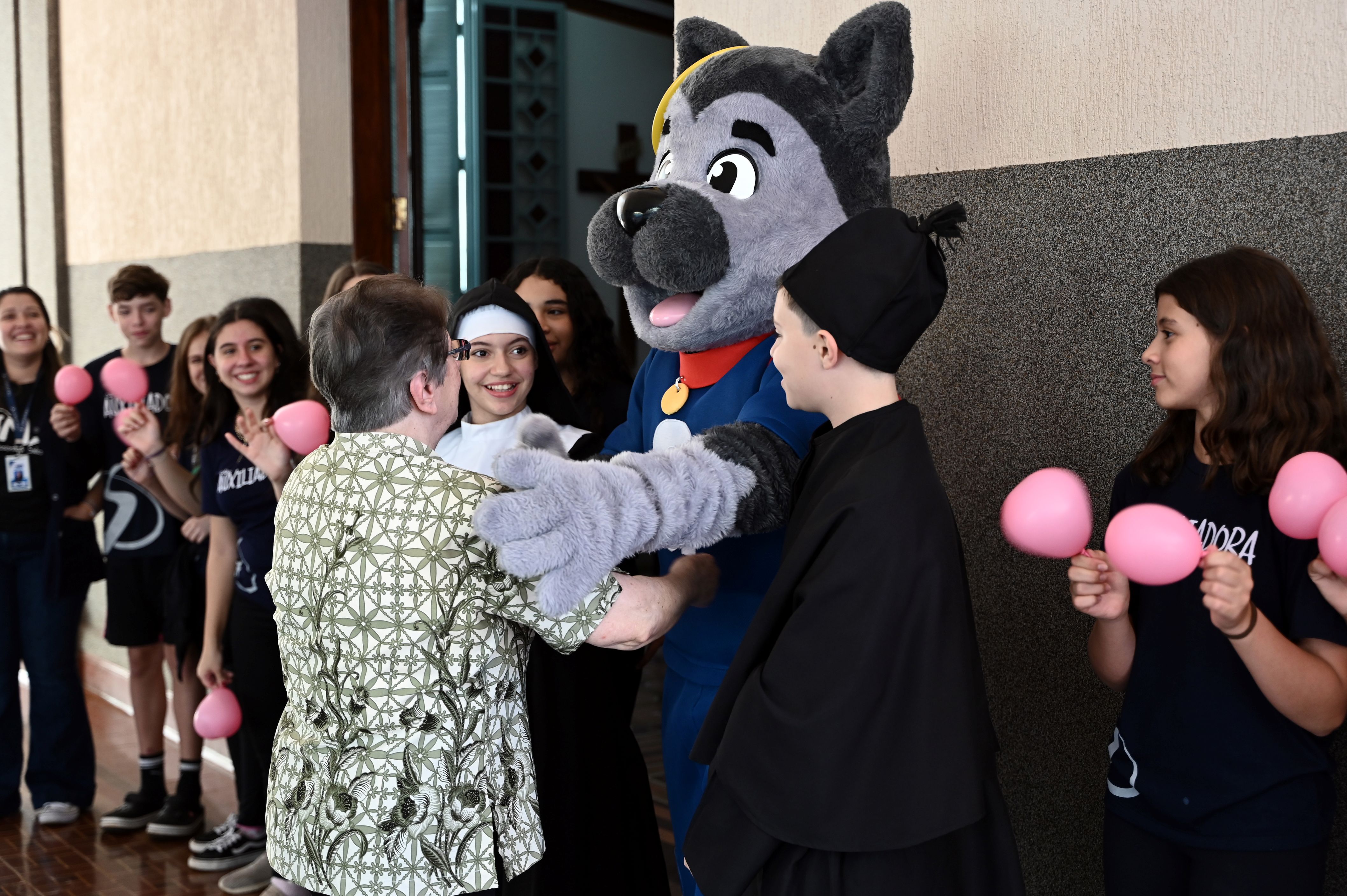 Na chegada ao colégio, Irmã Alaíde foi acolhida pelas Irmãs Salesianas da casa e pelo Conselho Local da Articulação da Juventude Salesiana (AJS). Dois estudantes, representando Dom Bosco e Madre Mazzarello, juntamente com a figura do fiel Grigio – o “cão-anjo” – deram um tom simbólico e afetuoso à recepção, expressando o carinho e a espiritualidade juvenil da comunidade educativo-pastoral.