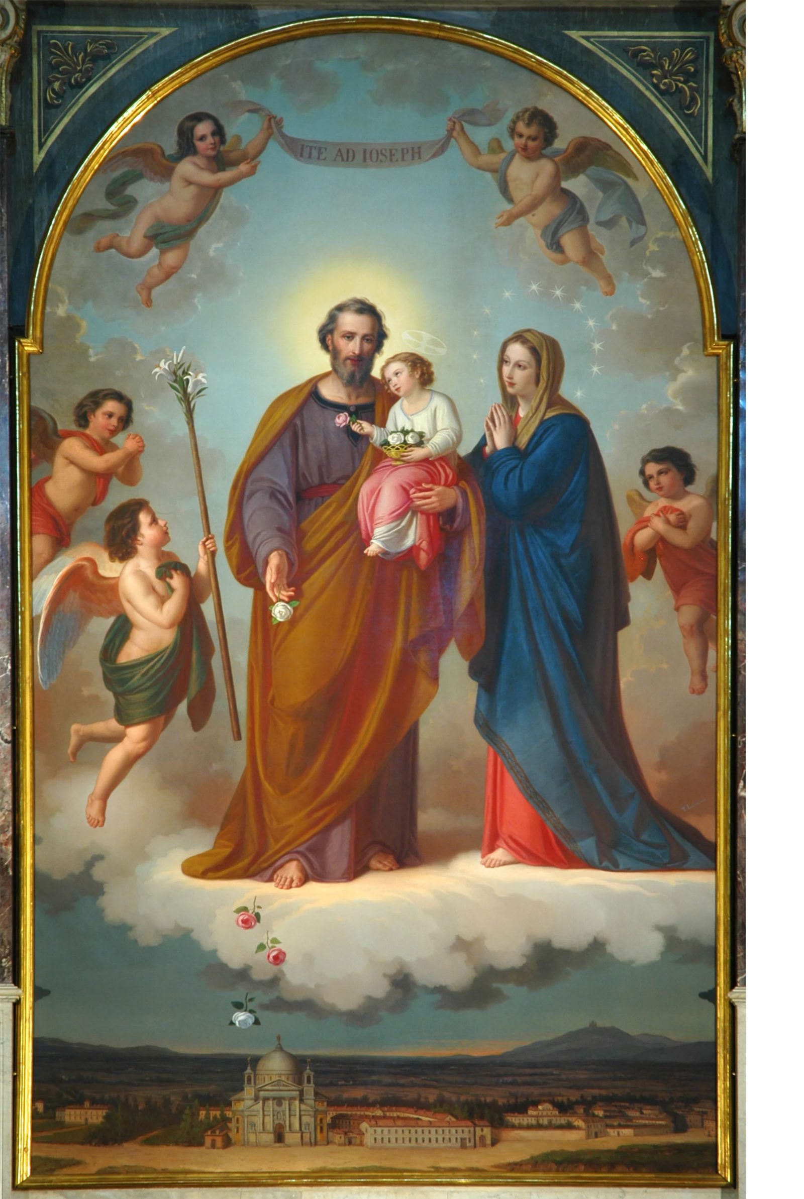 O Menino toma as rosas e as oferece a São José, que, aos poucos, vai deixando cair sobre a igreja de Maria Auxiliadora, que aparece na base do quadro. A atitude do Menino Jesus é muito graciosa, porque, voltado para seu Pai adotivo, lhe sorri com infinita doçura. Diante daquele sorriso divino, o Santo Patriarca parece extasiado, e poderíamos dizer que a alegria celestial do Divino Infante se duplica ao refletir-se na do amado semblante de São José.