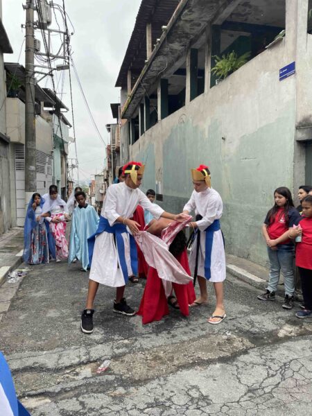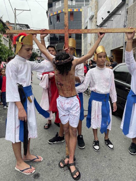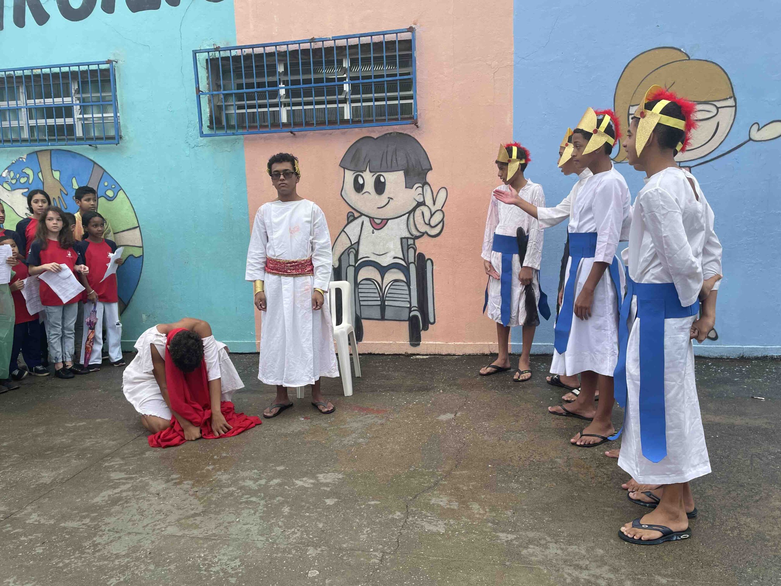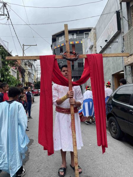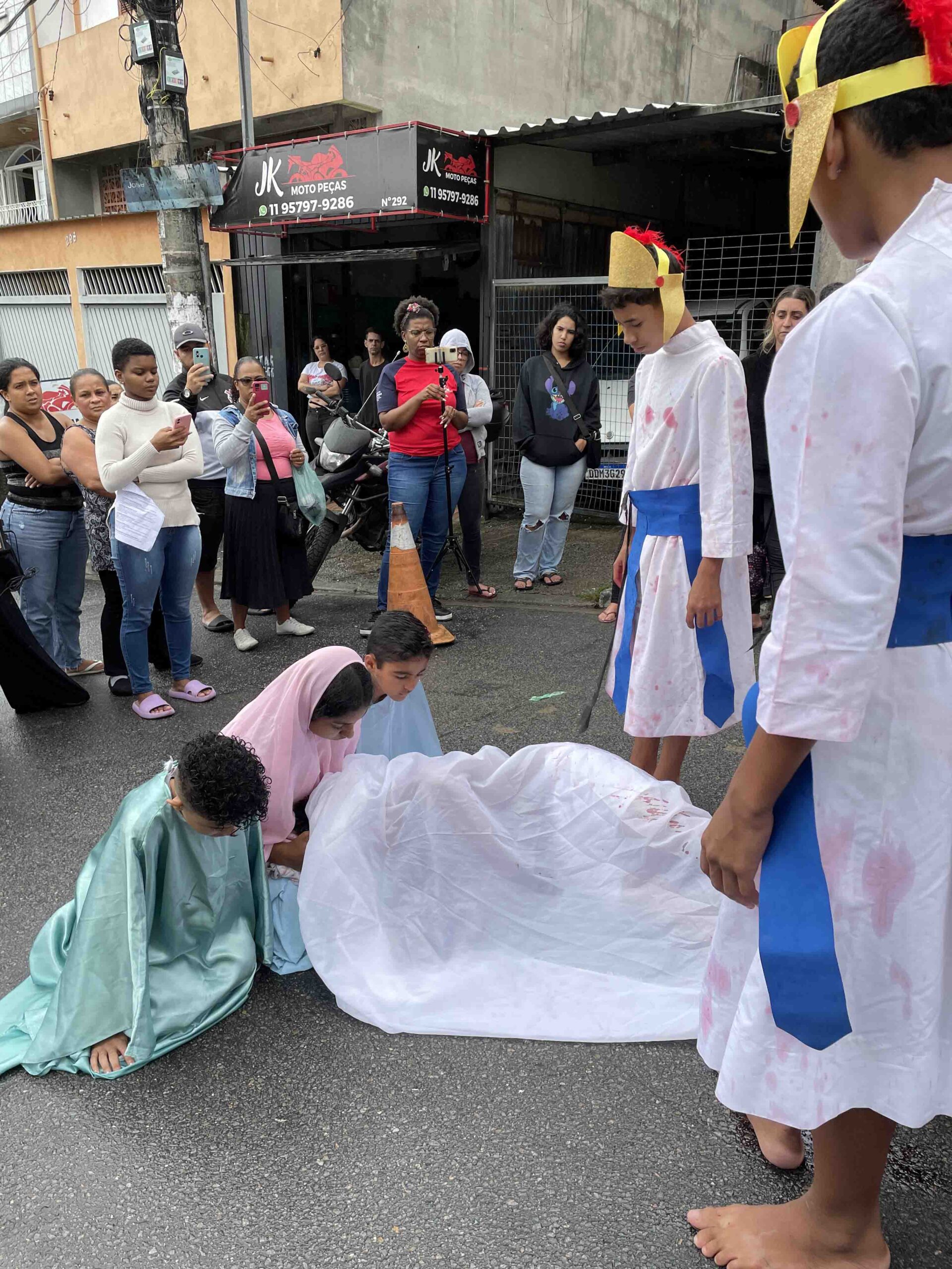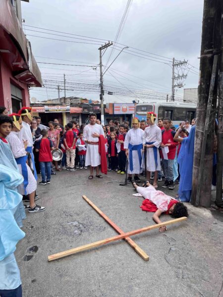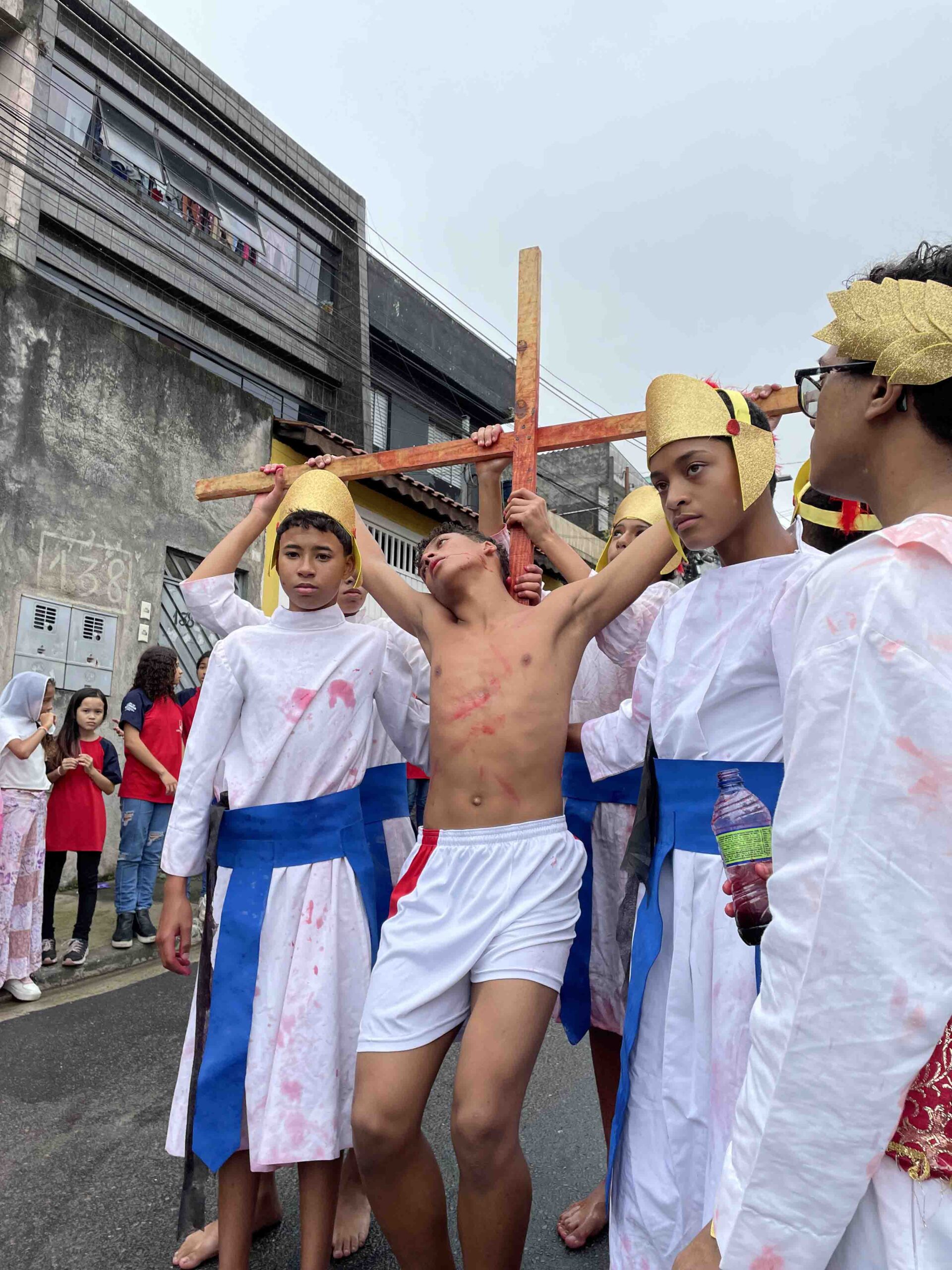 Na Semana Santa, como já é tradição, um evento muito aguardado pelas famílias e membros das comunidades atendidas pelo CCA, foi realizada a encenação da Via-Sacra pelas ruas da comunidade local. Na representação, as crianças e adolescentes da Oficina de Teatro tiveram a oportunidade de demonstrar publicamente o que aprenderam. As Oficinas de Dança e Música desempenharam um papel fundamental ao longo do percurso, sustentando os cânticos e inspirando aqueles que acompanhavam a Via-Sacra. Elas também atuaram como convite aberto para que outros se juntassem ao cortejo e participassem do momento.