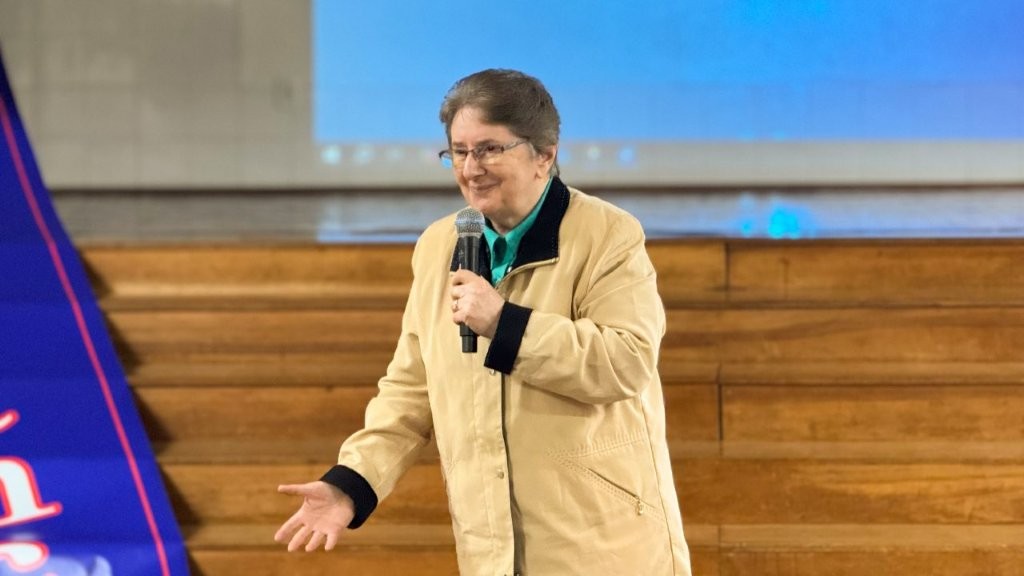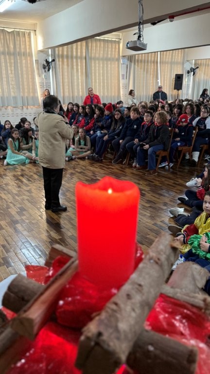 Na manhã do dia 16 de junho, no Salão de Atos da escola, a Irmã conduziu o tradicional “Bom Dia” com os estudantes. Durante o momento, compartilhou uma reflexão sobre os 150 anos da primeira expedição missionária do Instituto das Filhas de Maria Auxiliadora, destacando o símbolo do fogo como representação da fé e do ardor missionário.