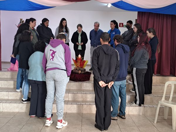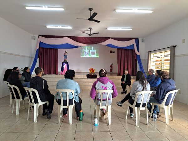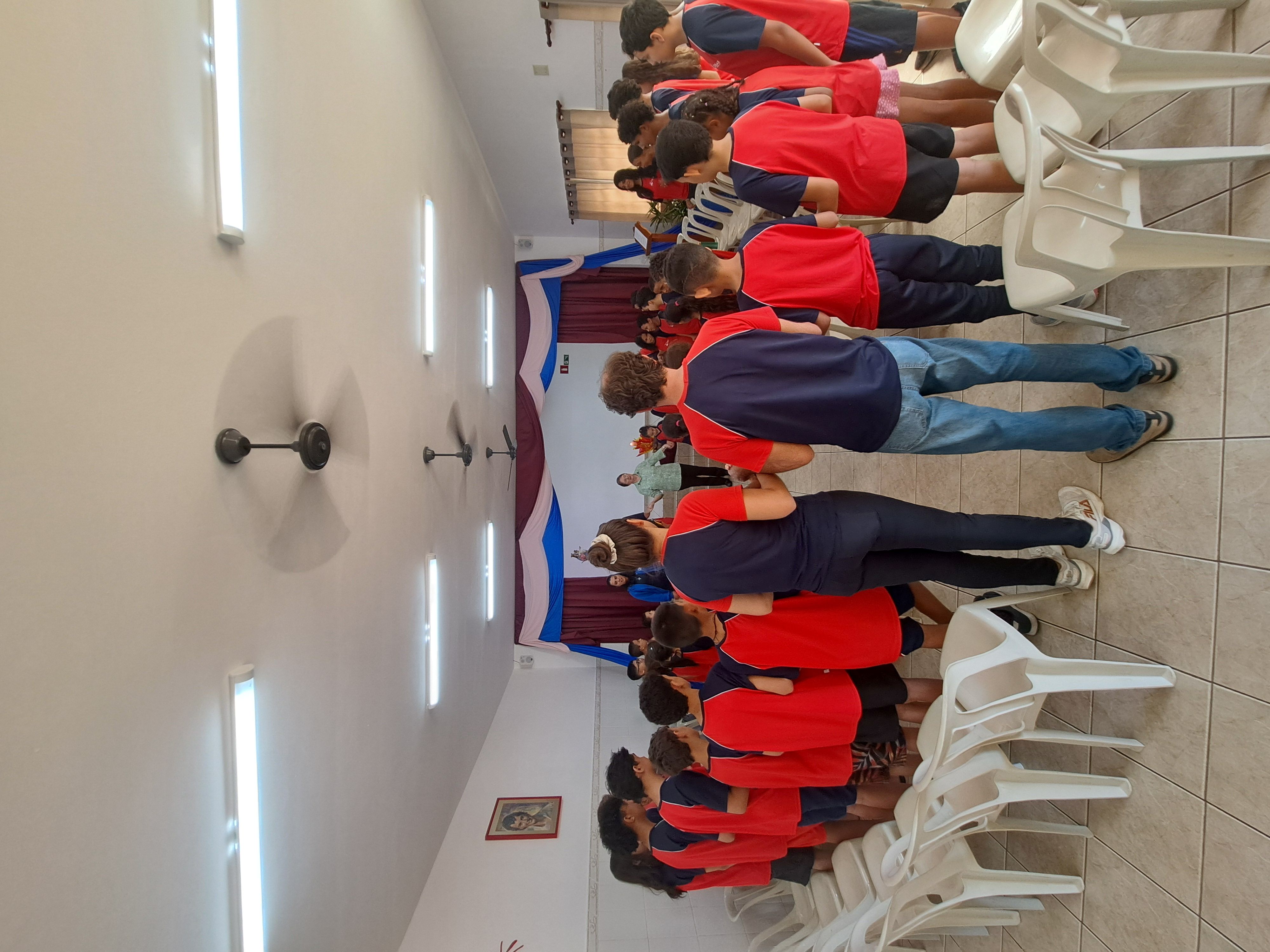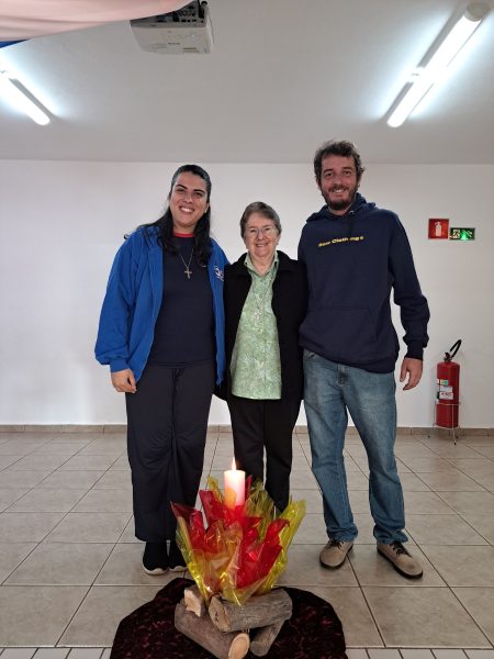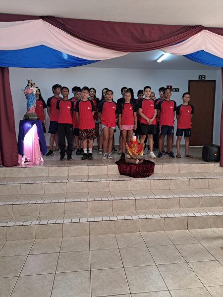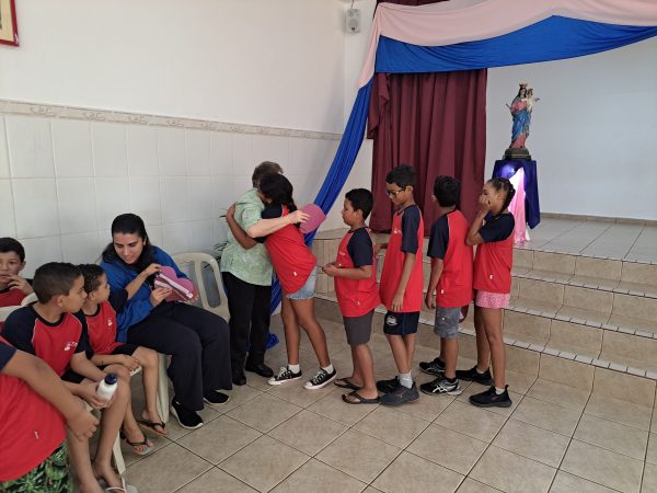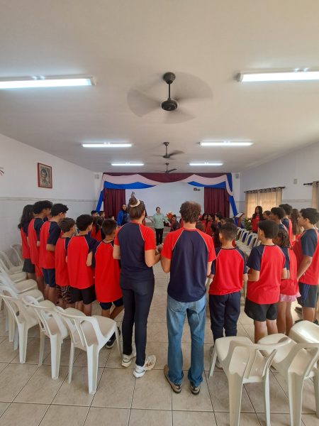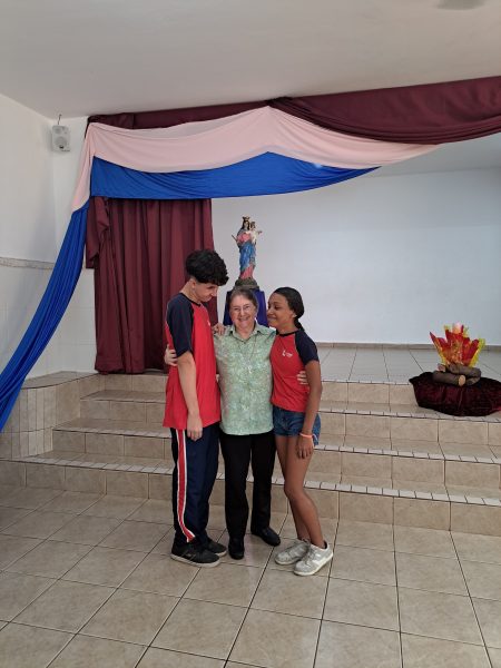 À tarde, foi a vez dos educandos homenagearem a visitante com um momento especial. Em um gesto cheio de carinho, os adolescentes leram frases em formato de coração e, em seguida, emocionaram a todos com a interpretação da música Oração (A Banda Mais Bonita da Cidade). Irmã Alaíde agradeceu com ternura e conduziu uma reflexão com os jovens, destacando a importância da partilha e como cada um pode contribuir para manter o “fogo aceso” por meio de seus dons e talentos.