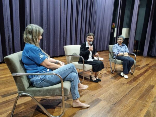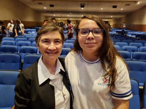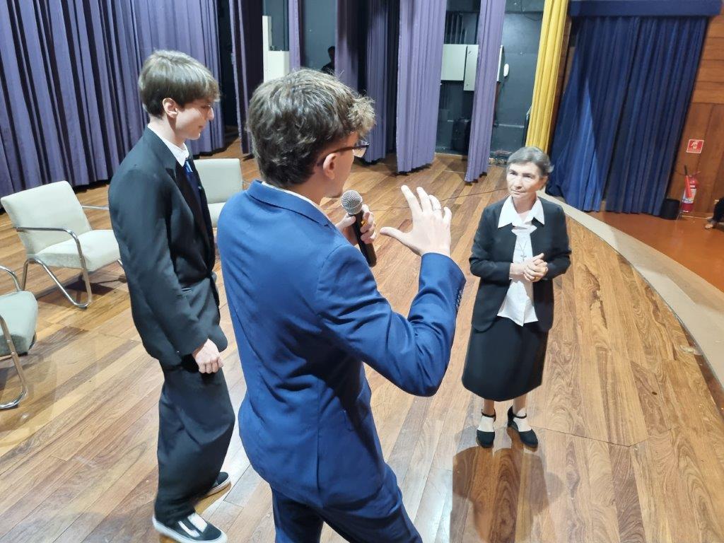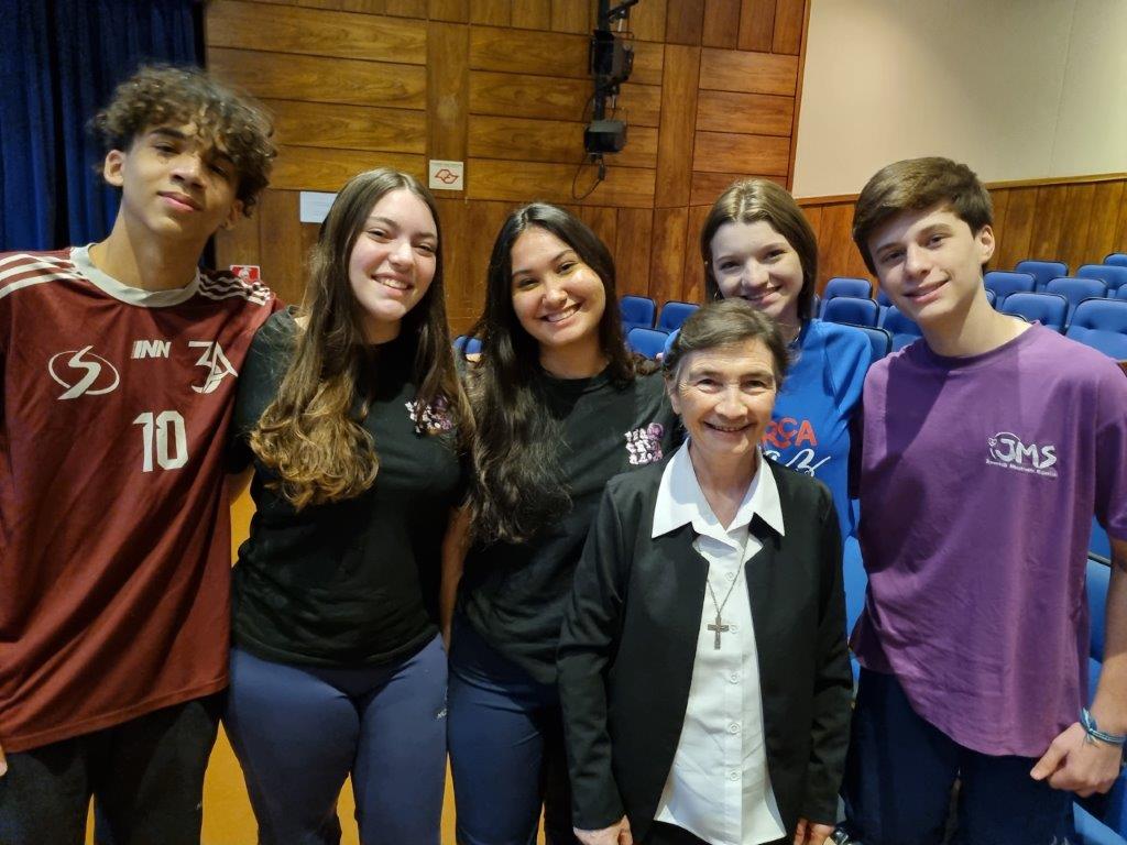 Os estudantes do Ensino Médio tiveram a oportunidade de entrevistar a Irmã Paola em um bate-papo descontraído, juntamente com a Diretora Pedagógica, Fabiana de Almeida, e a Irmã Solange Sanches, FMA.
