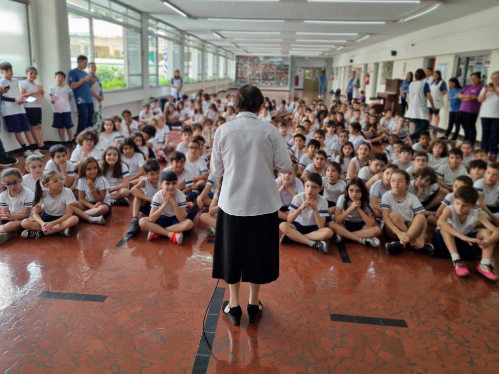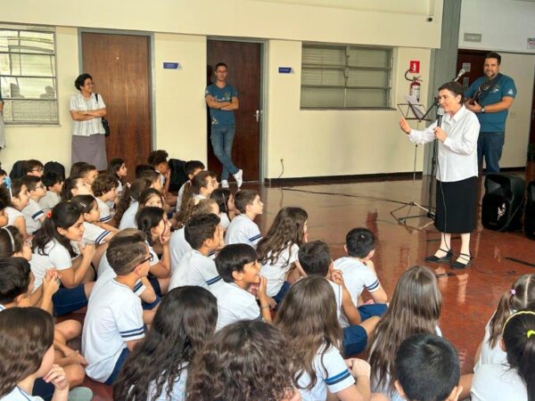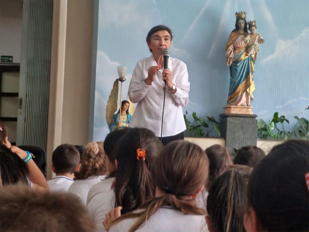 À tarde, Irmã Paola participou do momento do “Boa-Tarde” com as crianças da escola, que prepararam lindas homenagens com cantos marianos e de acolhida. Visivelmente emocionada, ela agradeceu pelo carinho, cantou com as crianças e trouxe para elas a presença viva do carisma das Filhas de Maria Auxiliadora, recordando a presença de Santa Maria Mazzarello.