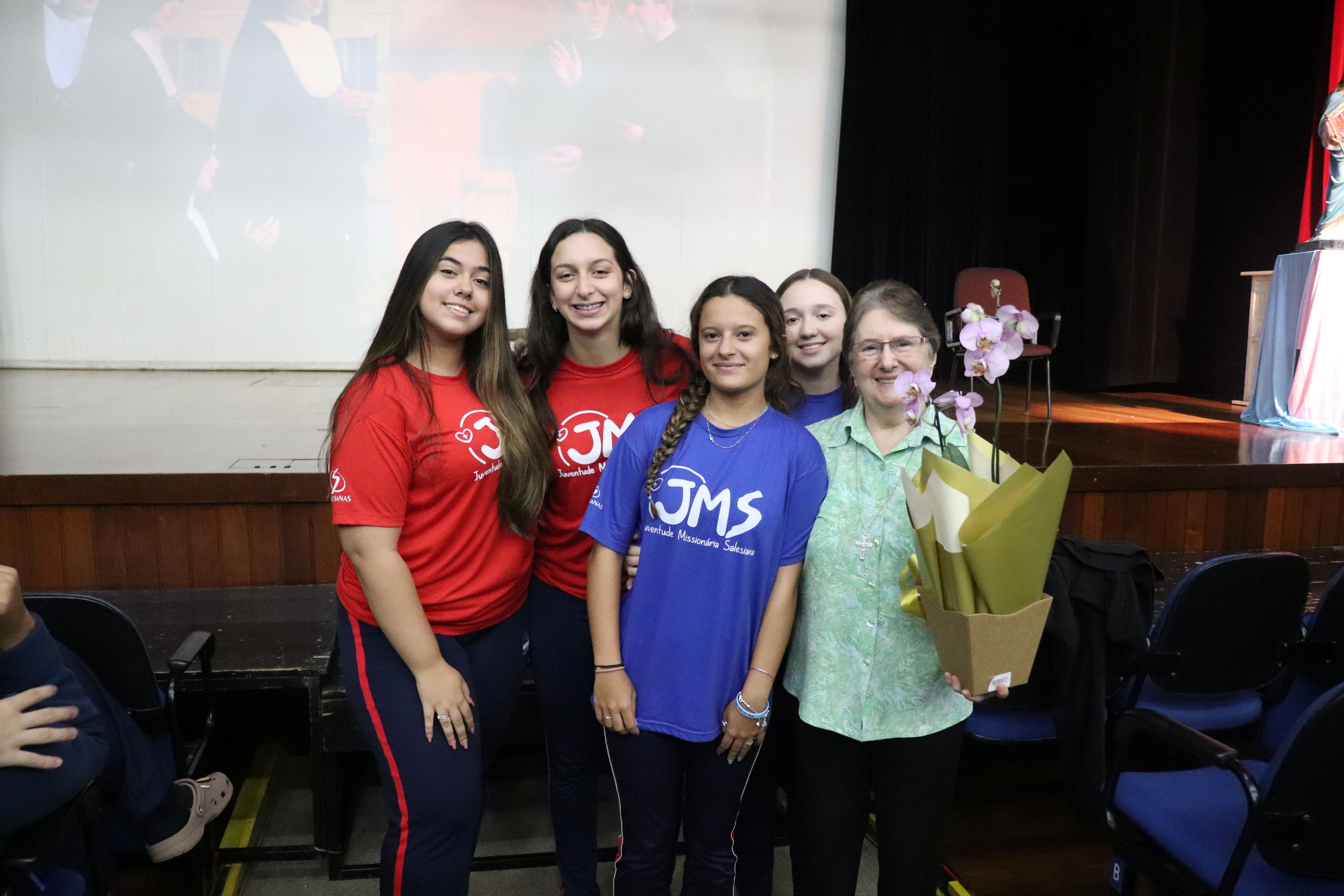 Antes de partir para visitar também o Instituto Laura Vicuña, Irmã Alaíde teve um encontro especial com a equipe da Articulação da Juventude Salesiana (AJS) e com os representantes de classe, salientando a importância do trabalho de cada um deles, como braço direito da diretora e da equipe pedagógica, não só como líderes do futuro, mas do presente.